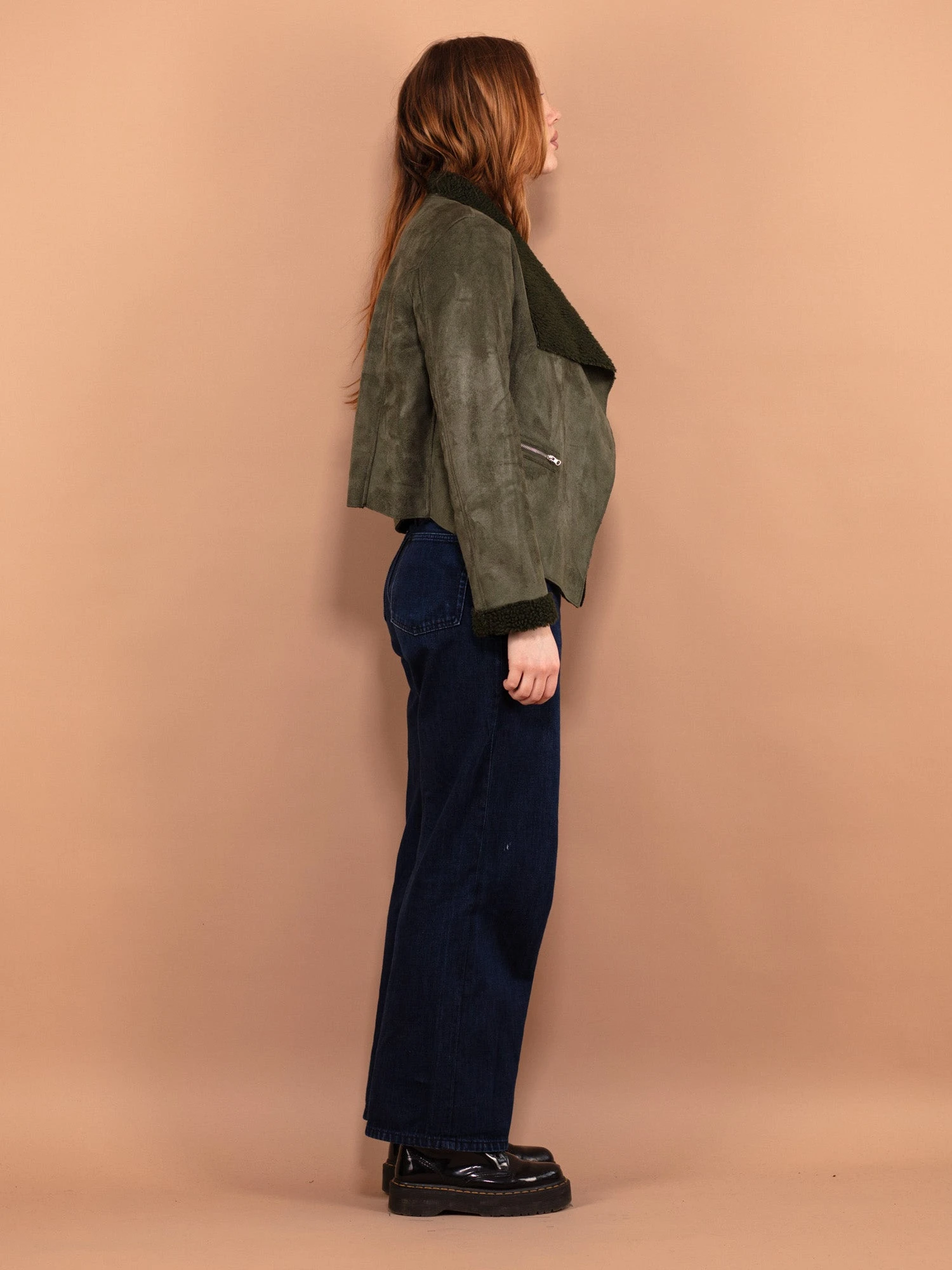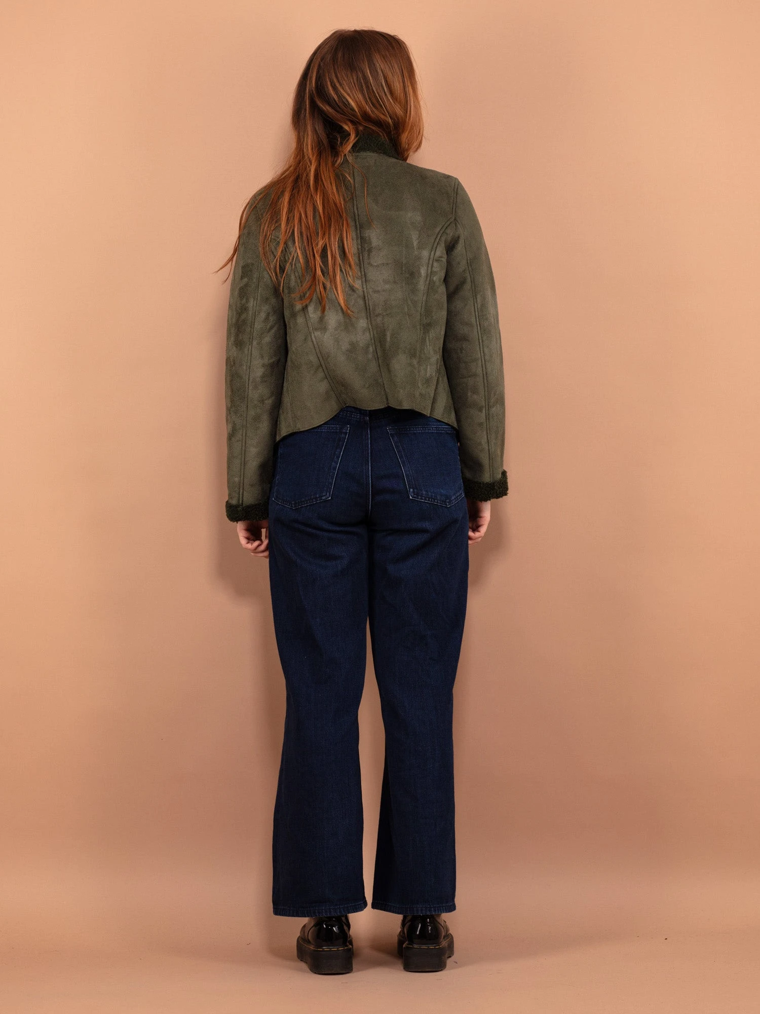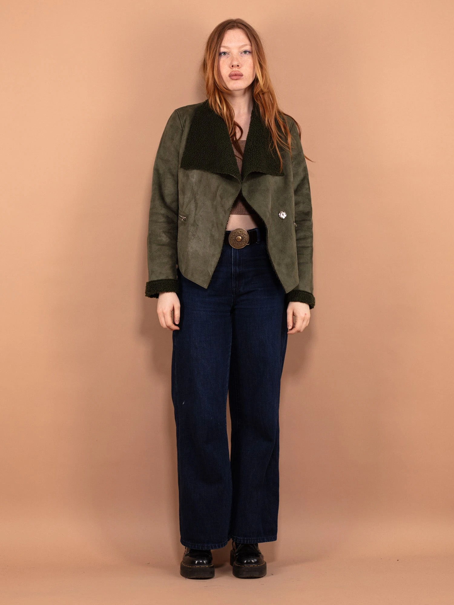 A faux shearling jacket in a soothing green shade from the 00s. The classic design features a single snap summary closure down the front with two zip outer pockets. This cruelty-free piece gives you the sheepskin look without any harm to the animals; it’s made from 100% polyester fabrics.