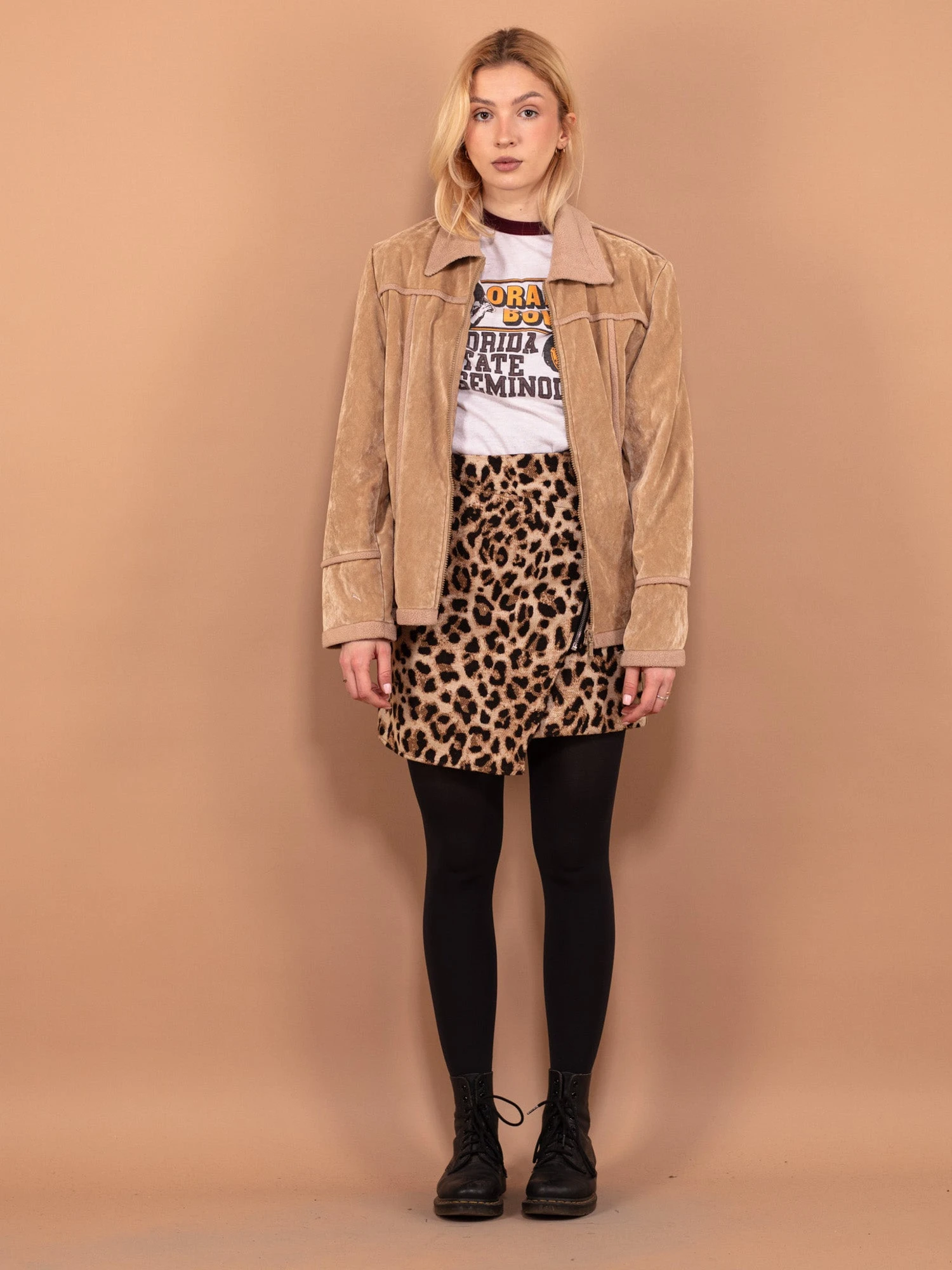 A faux suede sherpa jacket from the 00s featuring a zipper closure and two side-entry pockets. Crafted from faux suede and fully lined with polyester fleece fabric (100% polyester).