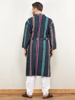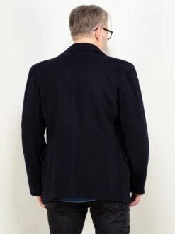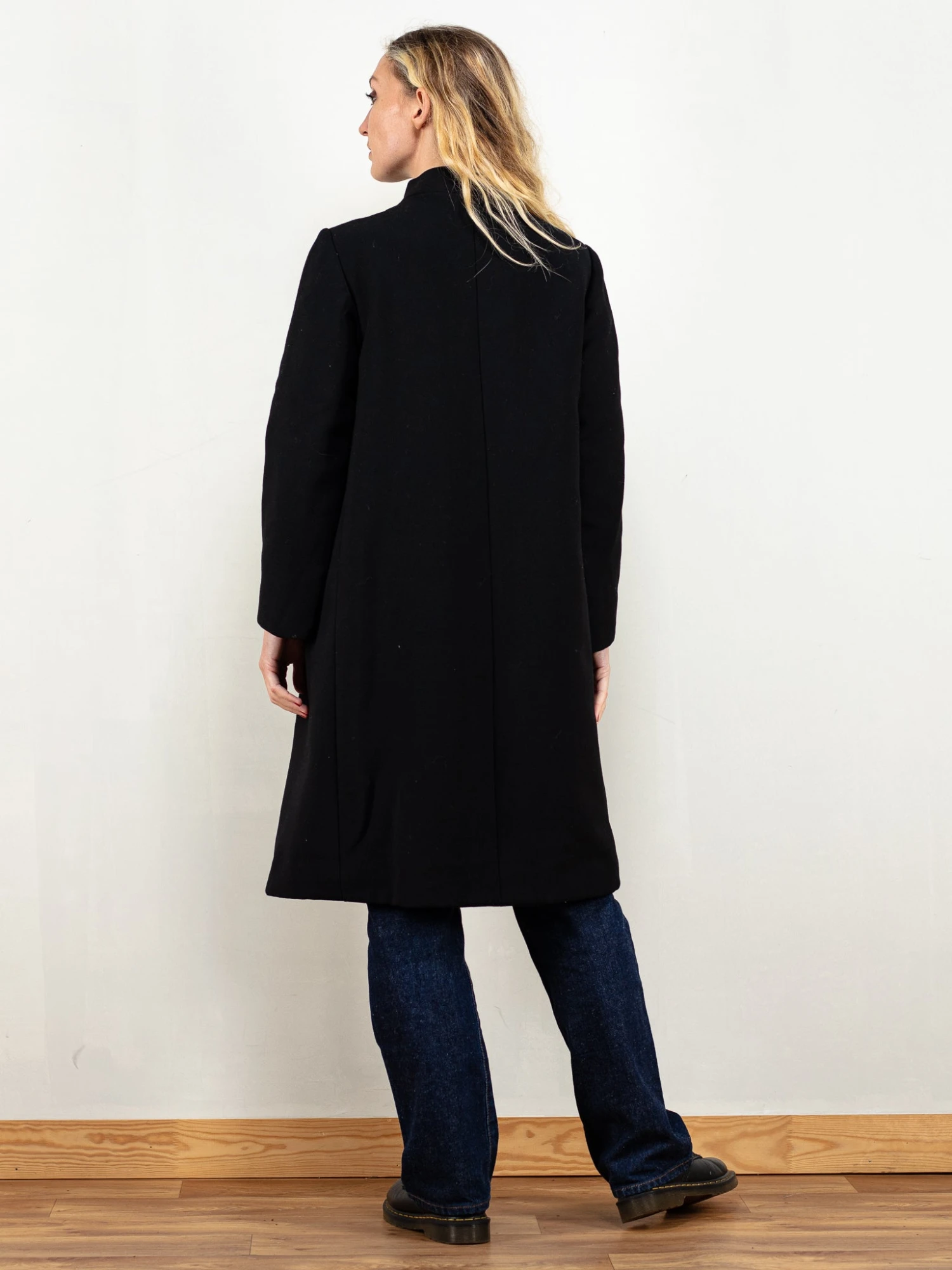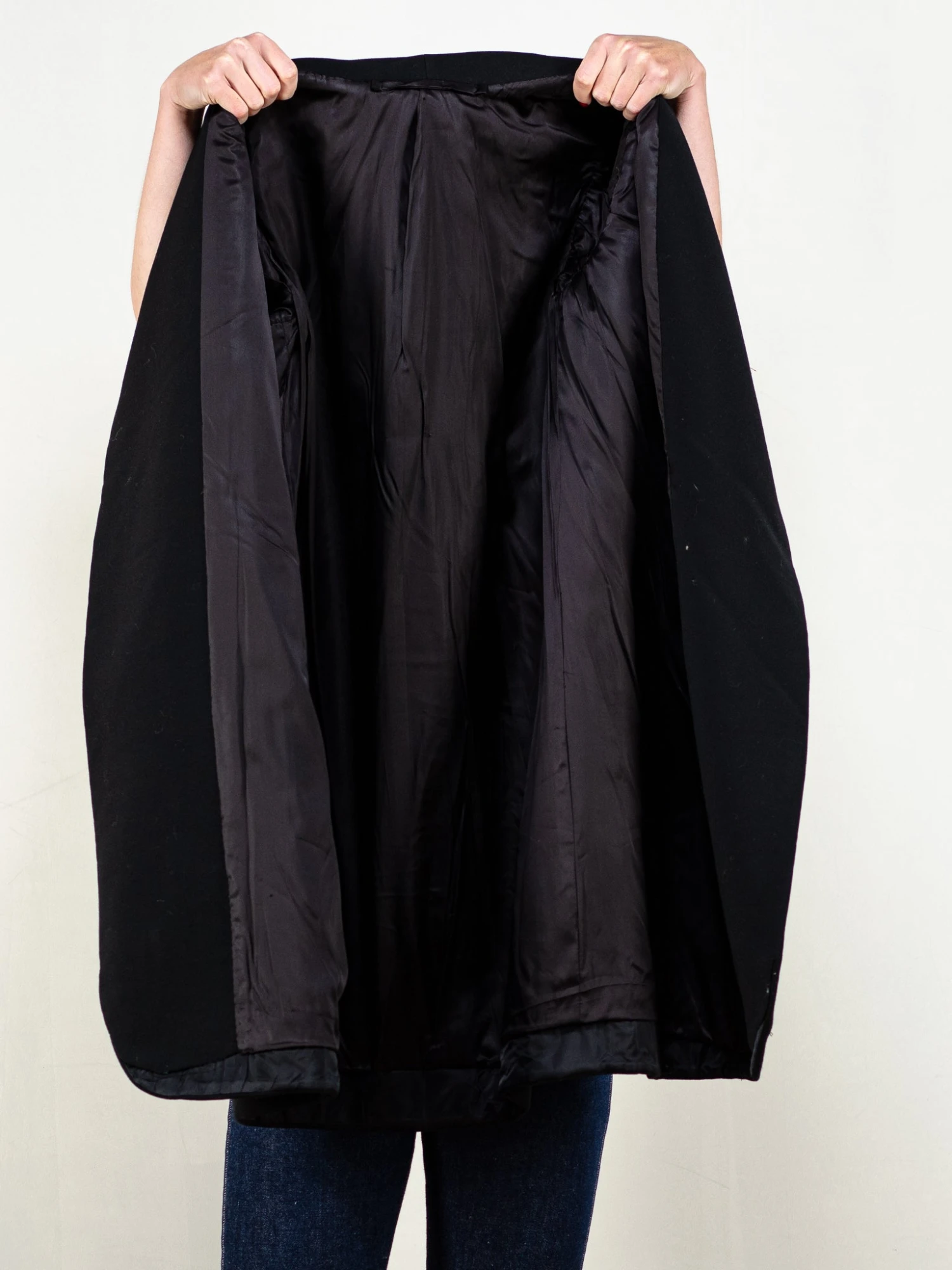 This is a vintage 60’s black wool blend coat. Wrap design with one summary closure on the chest, no pockets. Lined with synthetics in black.