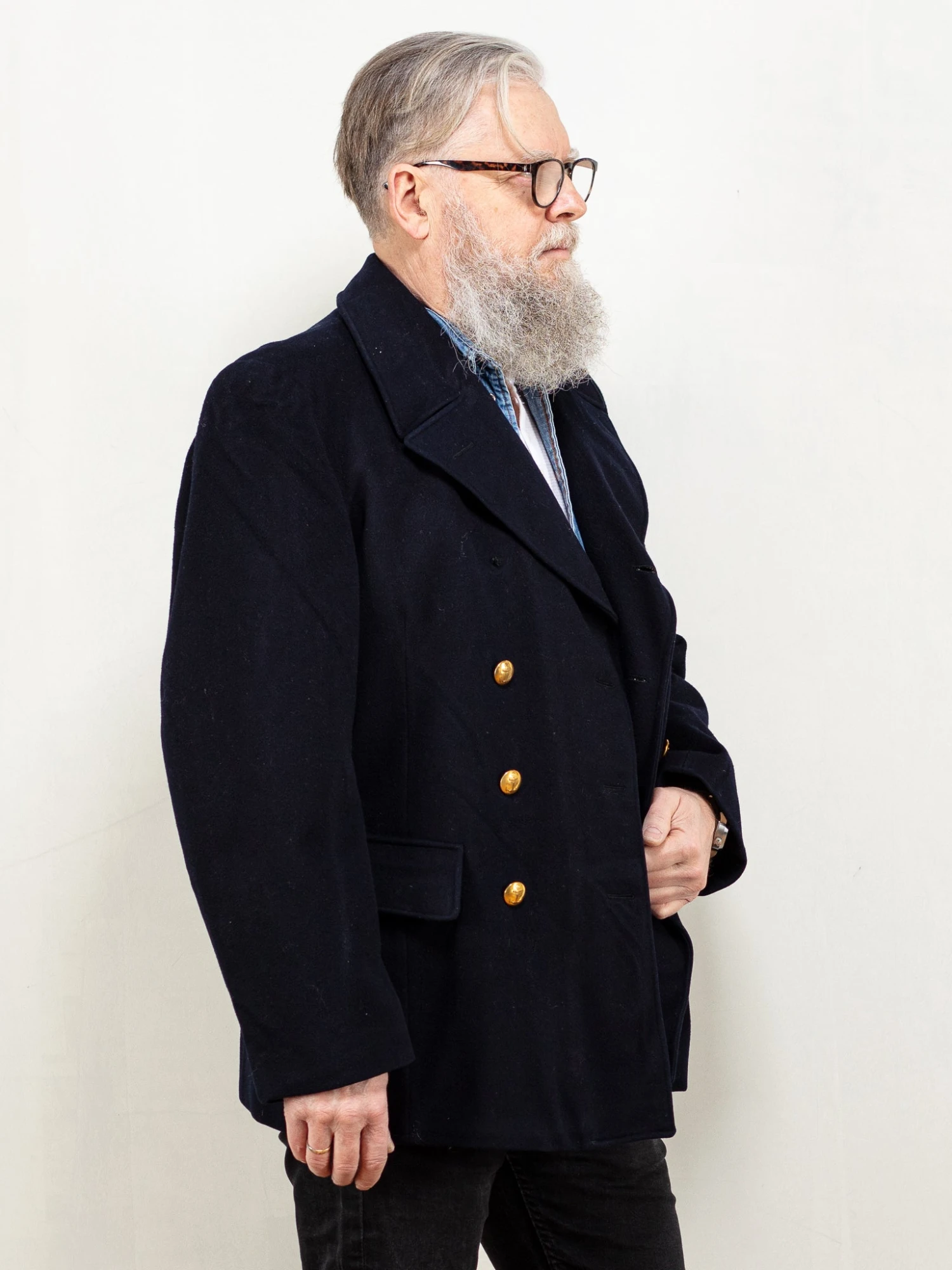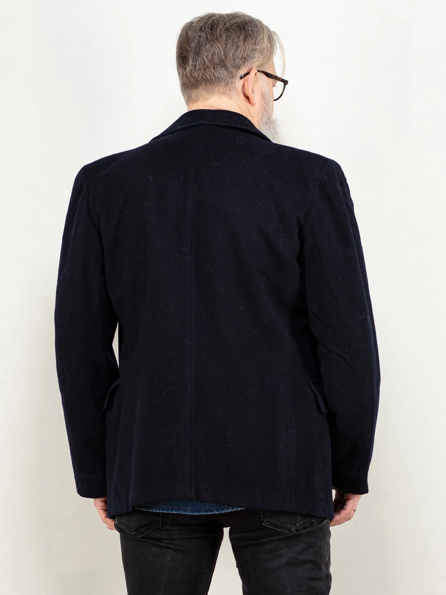 Vintage 70’s wool peacoat in navy blue. Features a notched collar, double-breasted summary closure, two side-entry pockets, and one inside pocket. The composition label is missing but the material feels like a wool or wool blend.