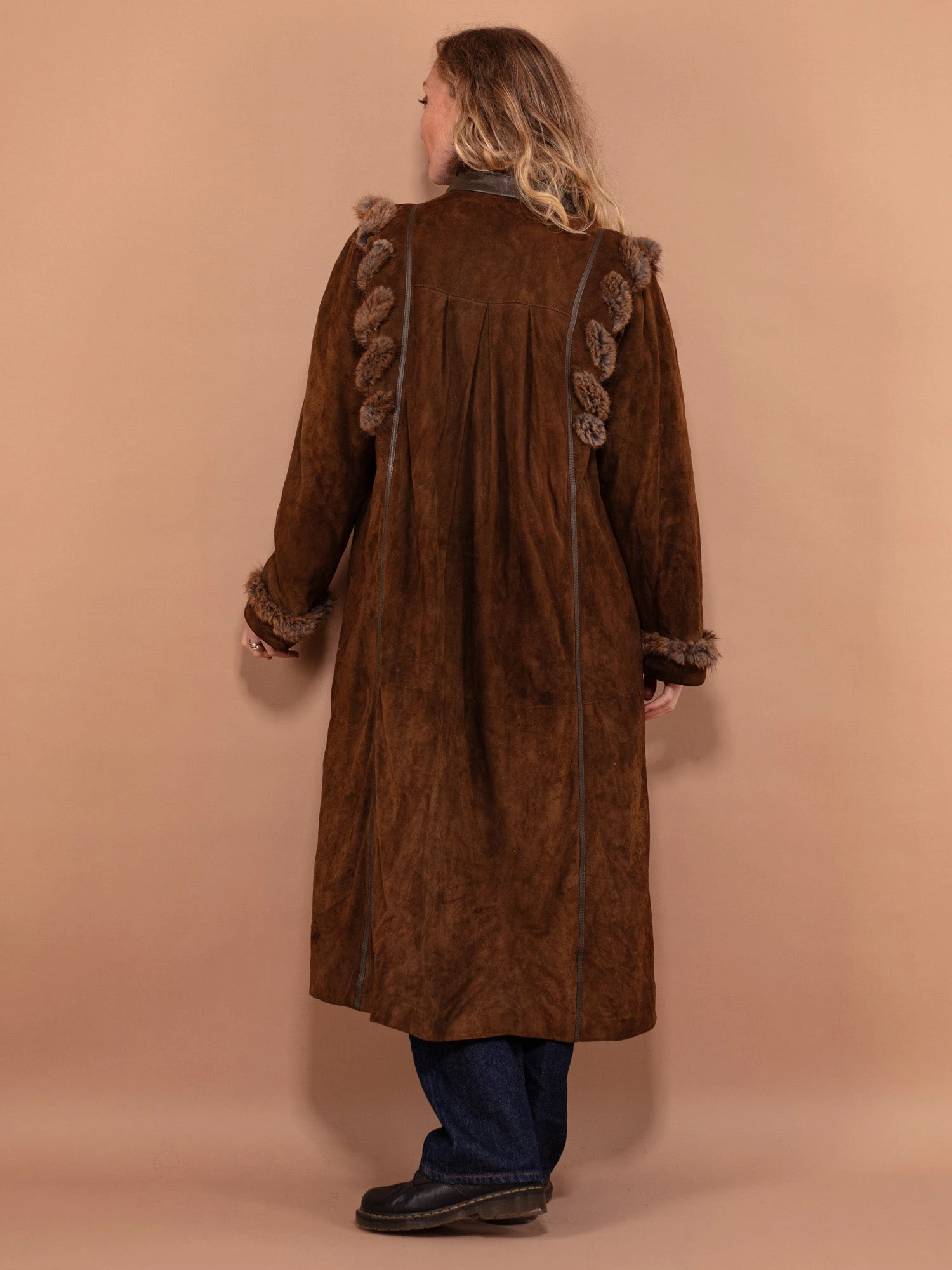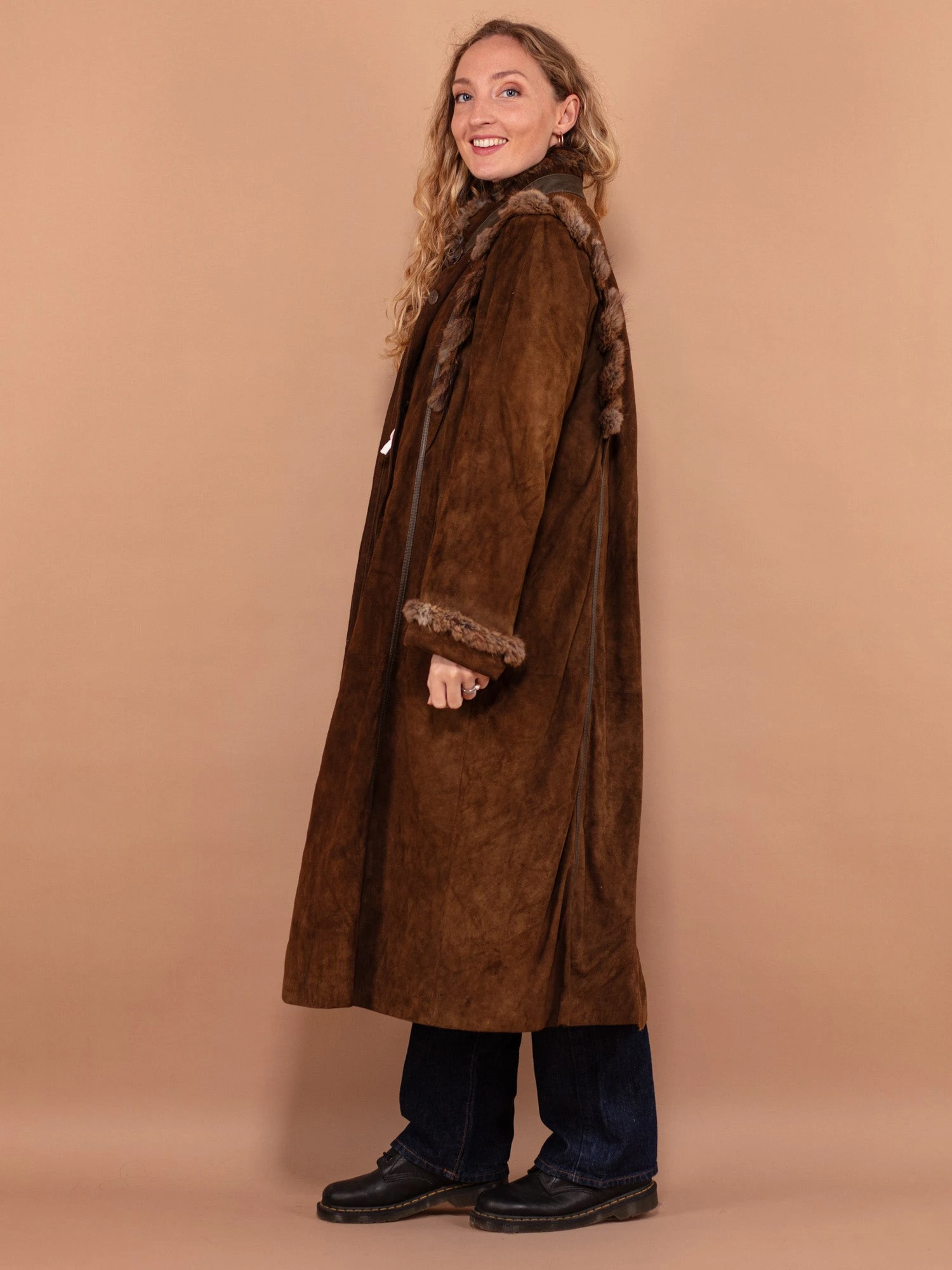 Vintage women’s brown suede maxi coat from the late 70’s / early 80’s, featuring a real fur trimmed cuffs, collar and shoulders. The design features straight longline silhouette with concealed front summary fastening, an adjustable strap at the stand collar, and 2 welt pockets at hips. Made of real suede with quilted polyester lining in brown.
