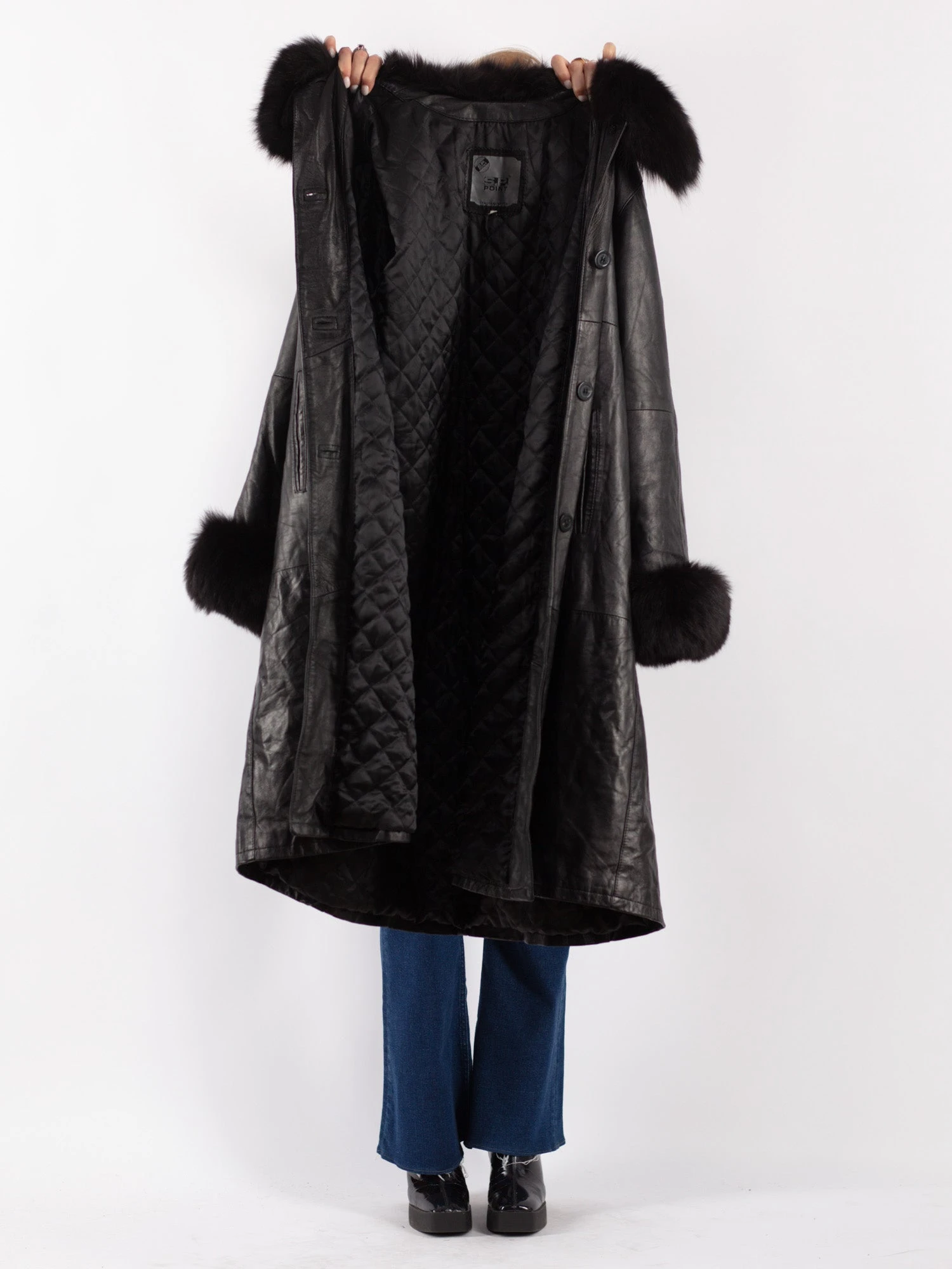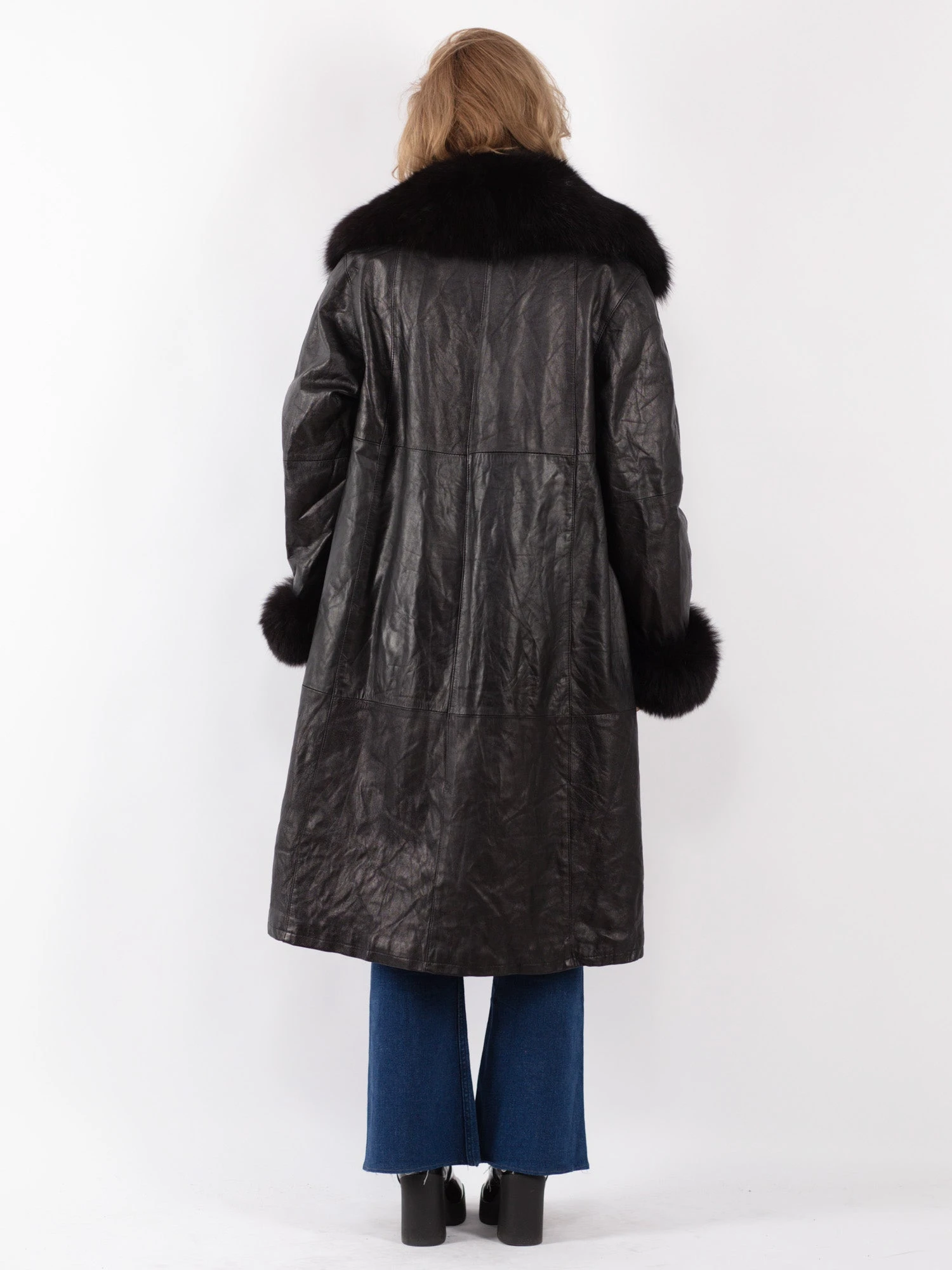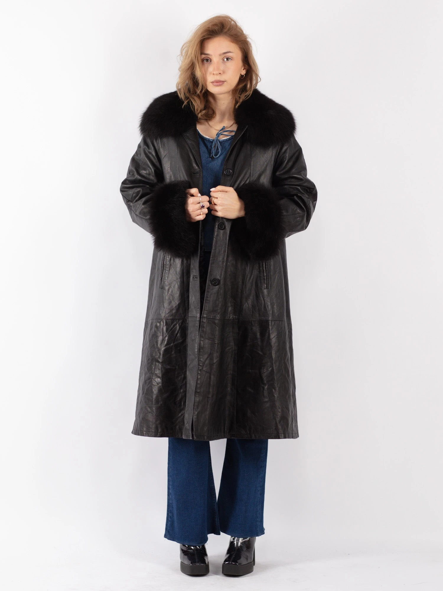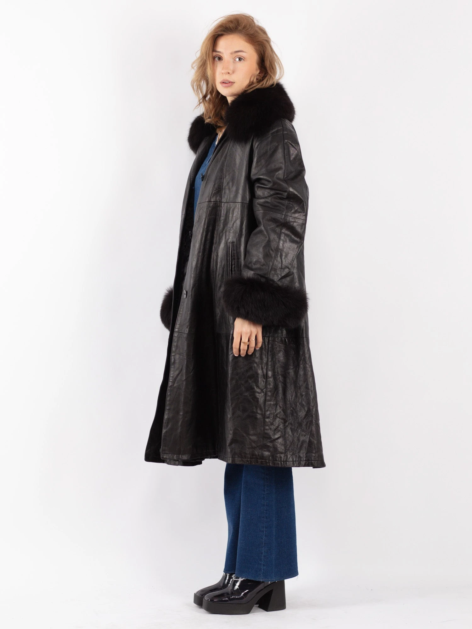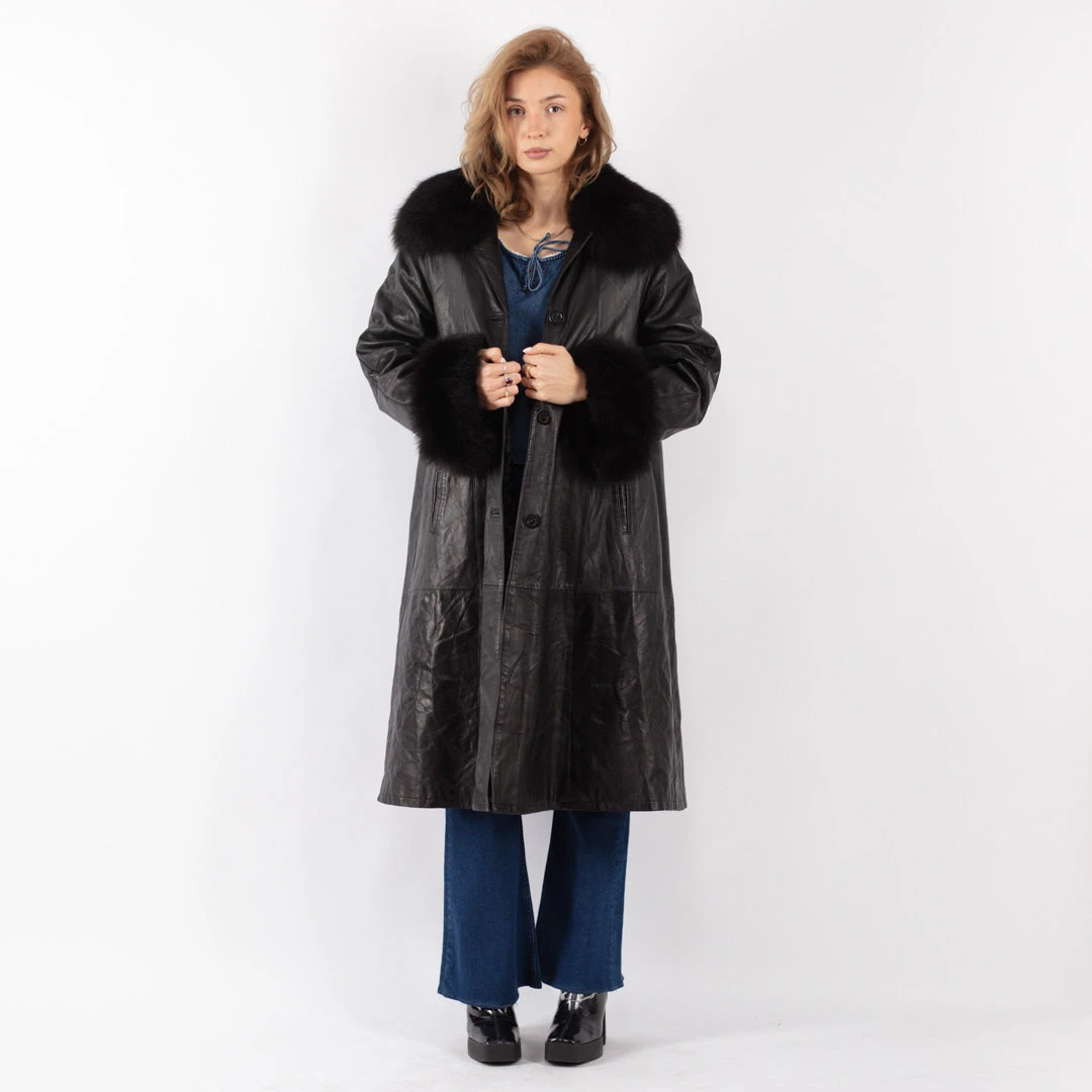 Black Vintage 70’s Women Leather Fur Long Coat in Black With Free Delivery