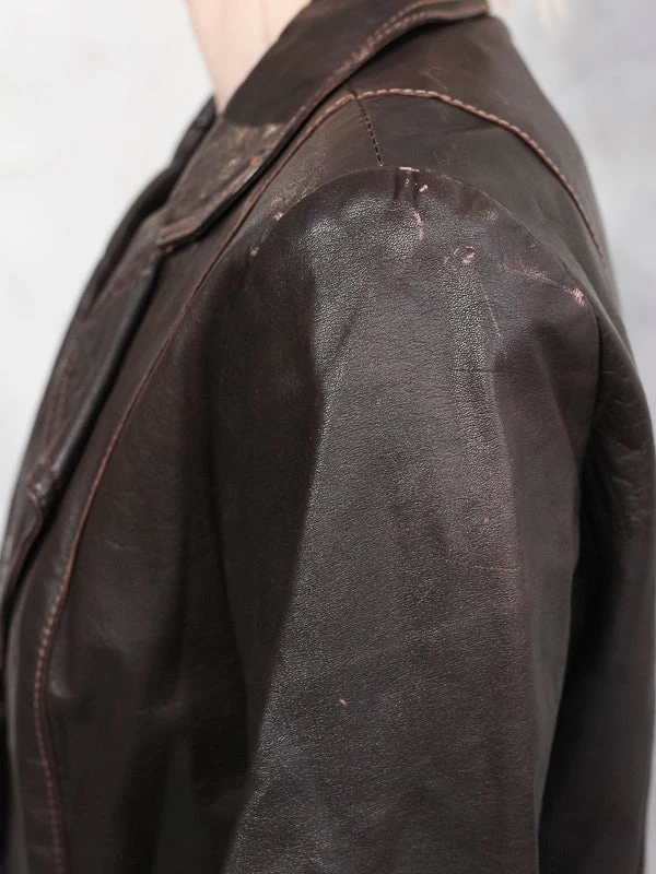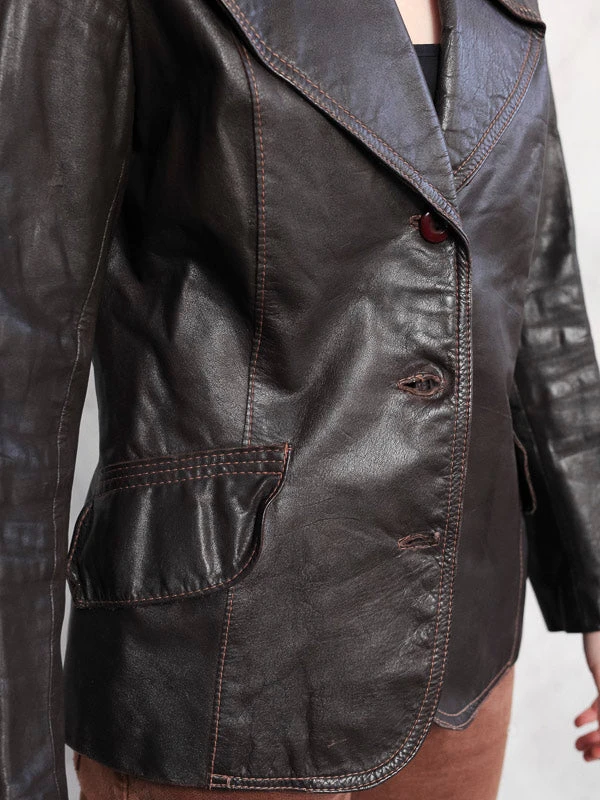 Stunning and bold vintage 70’s leather jacket in brown. Features summary closure, two front pockets and very silky lining. Will look perfect with denim items for daily adventures or with dress for more fancy look. Has some worn out spots.