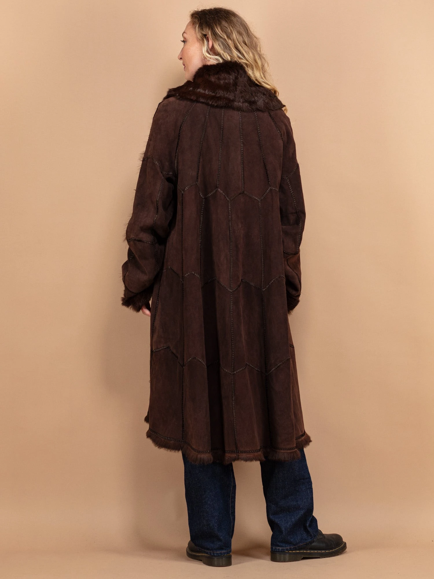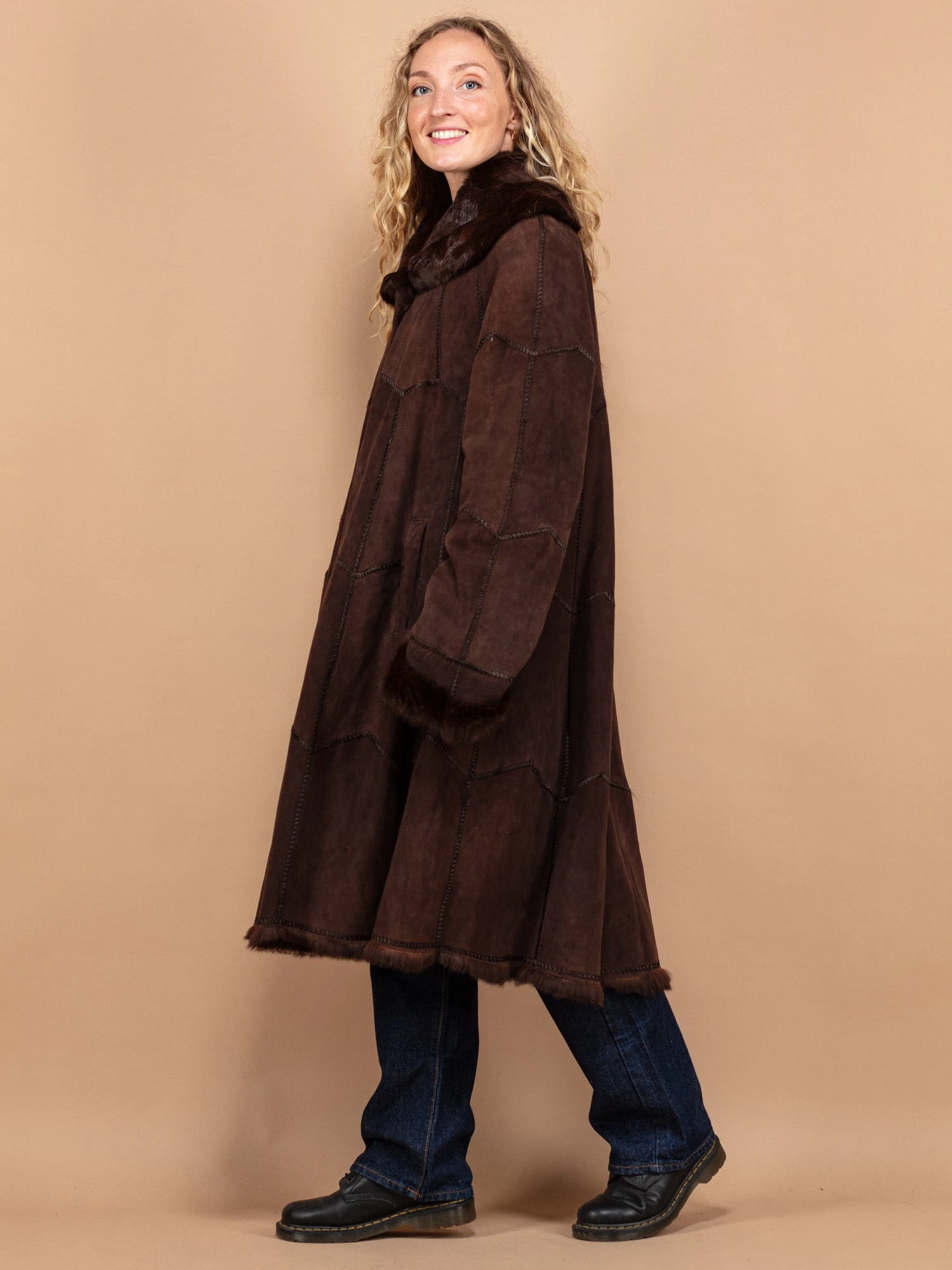 Wrap yourself in vintage elegance and comfort with this original 70’s lapin (rabbit) fur long coat in brown. The design features a single-breasted summary closure and two convenient side-entry pockets. Made in Italy from genuine suede and adorned with silky soft, warm rabbit fur for a luxurious feel. It’s not just a coat; it’s a blend of timeless fashion and comfort that you’ll love to wear.