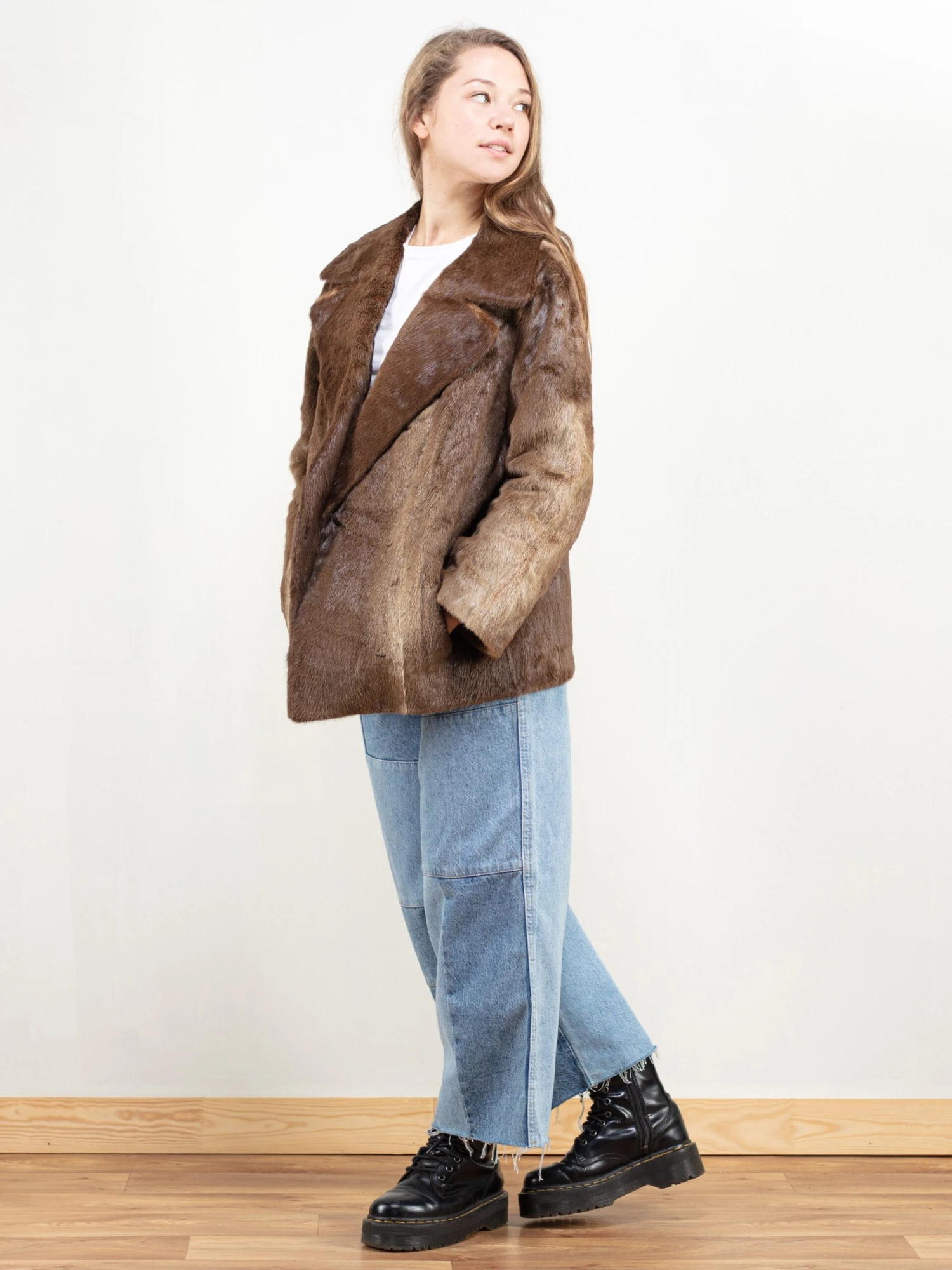 If you are looking for something fancier- this is the right one- a vintage 70’s real fur jacket in brown. This one features silky lining, hook and eye closure, two outer pockets, and one inside.