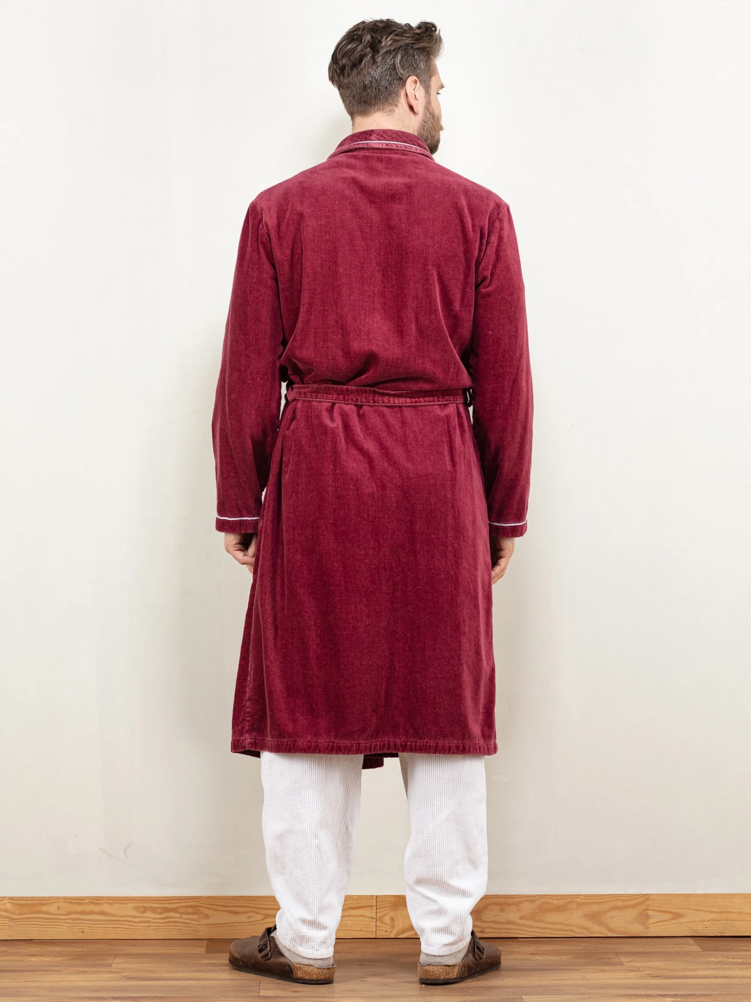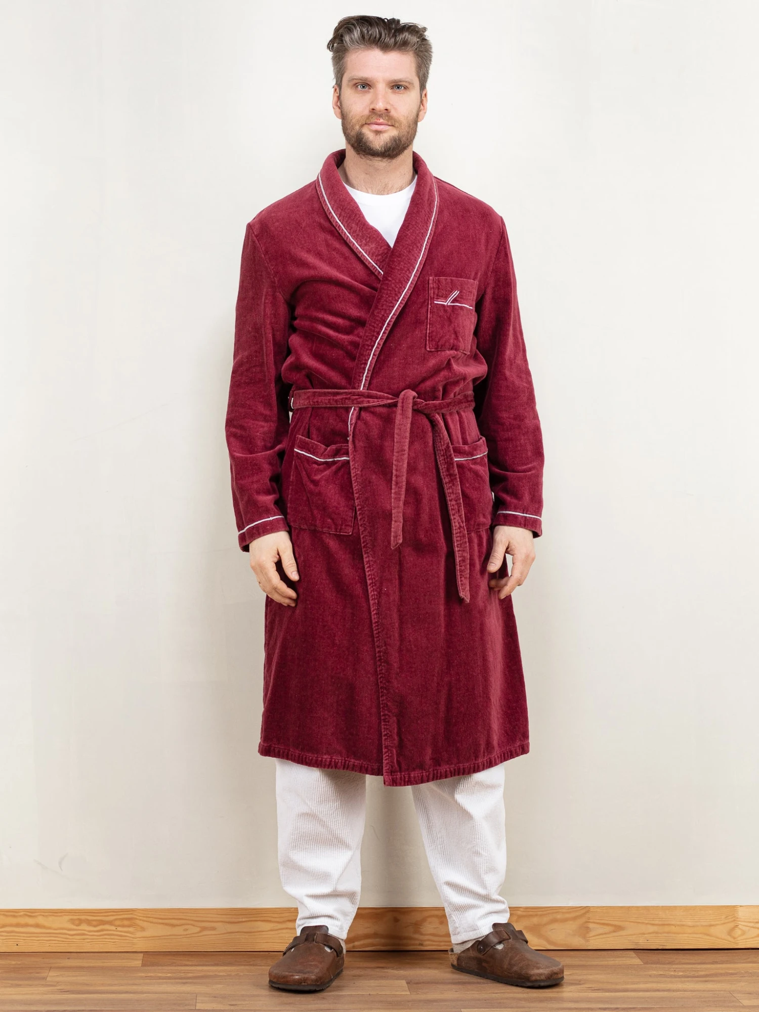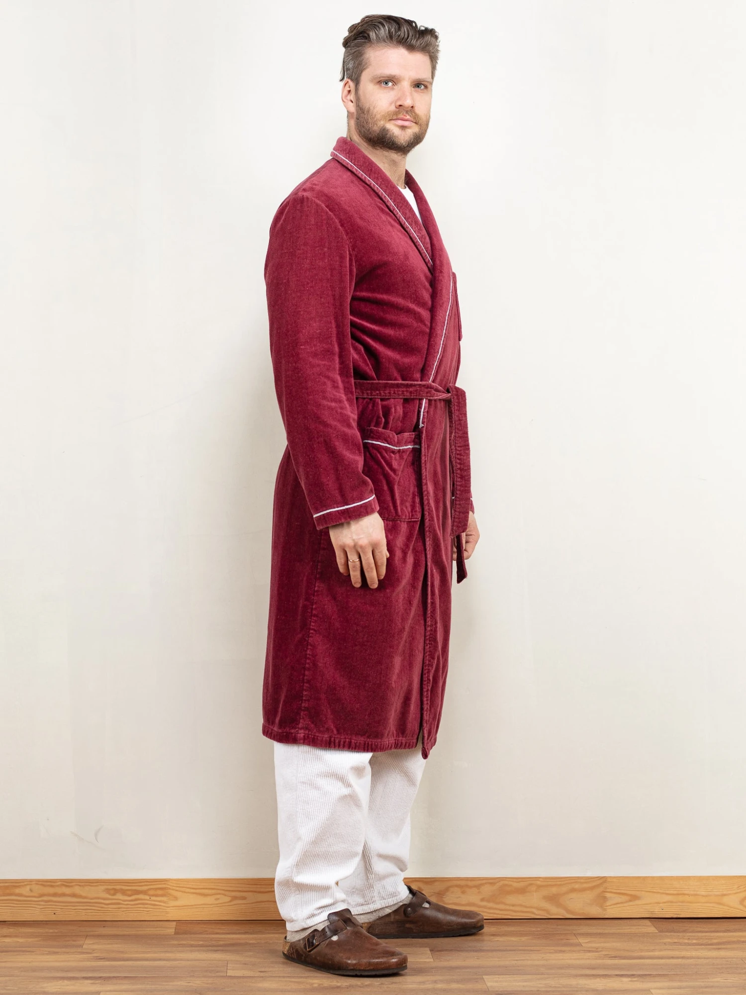 A vintage 80’s men’s bathrobe in red. Crafted from terry fabric. The robe has three outer pockets and a belt.
