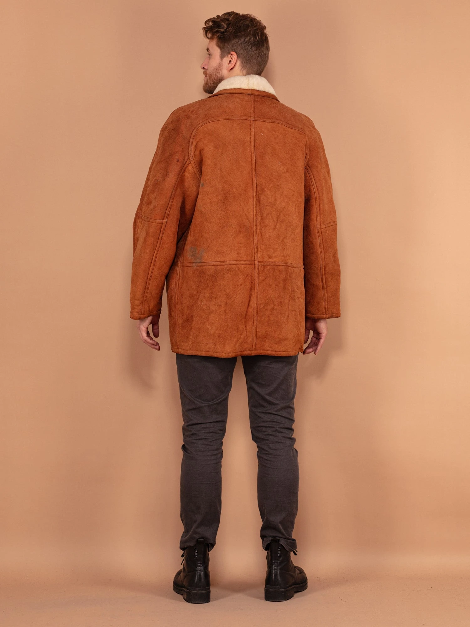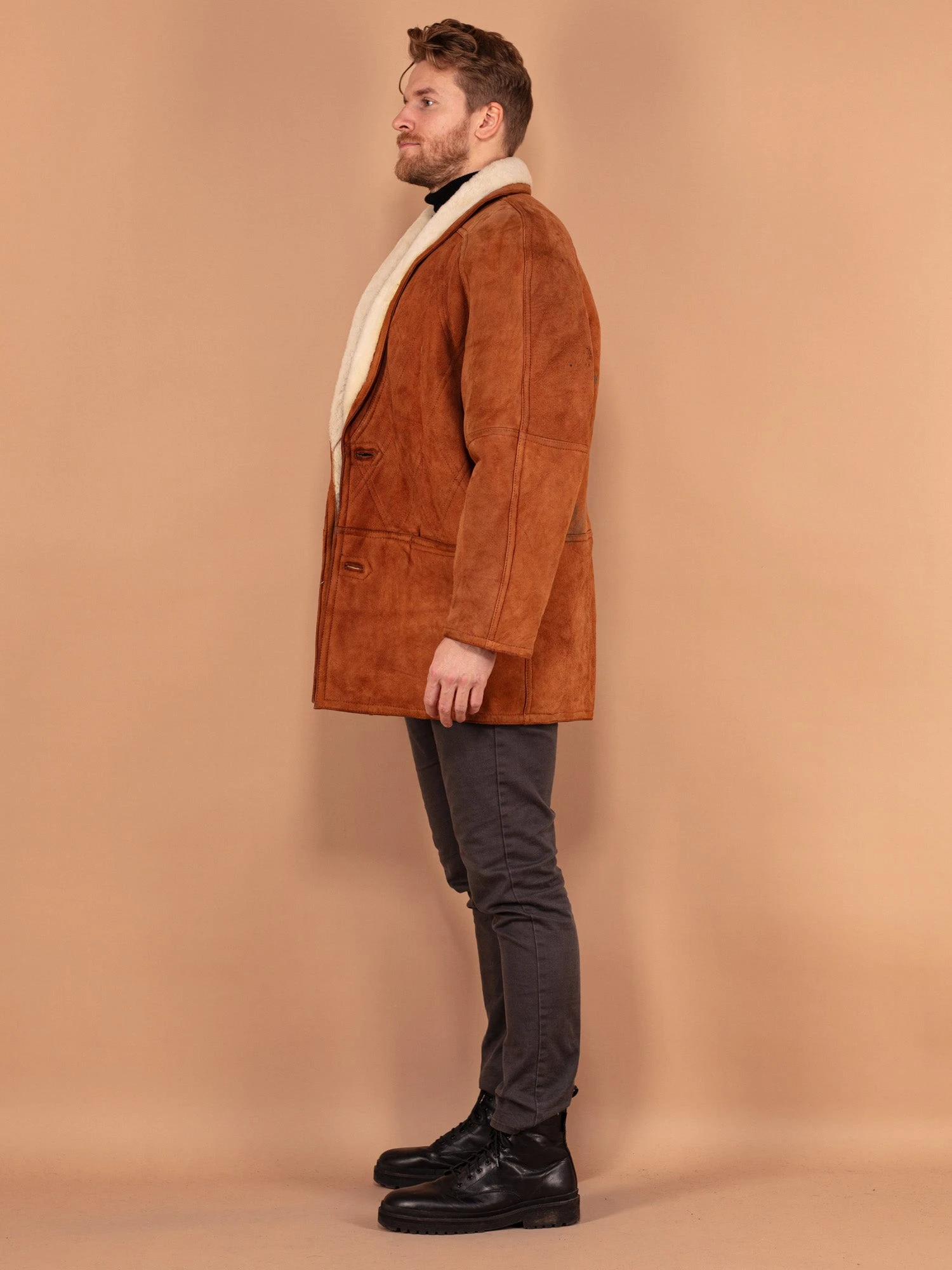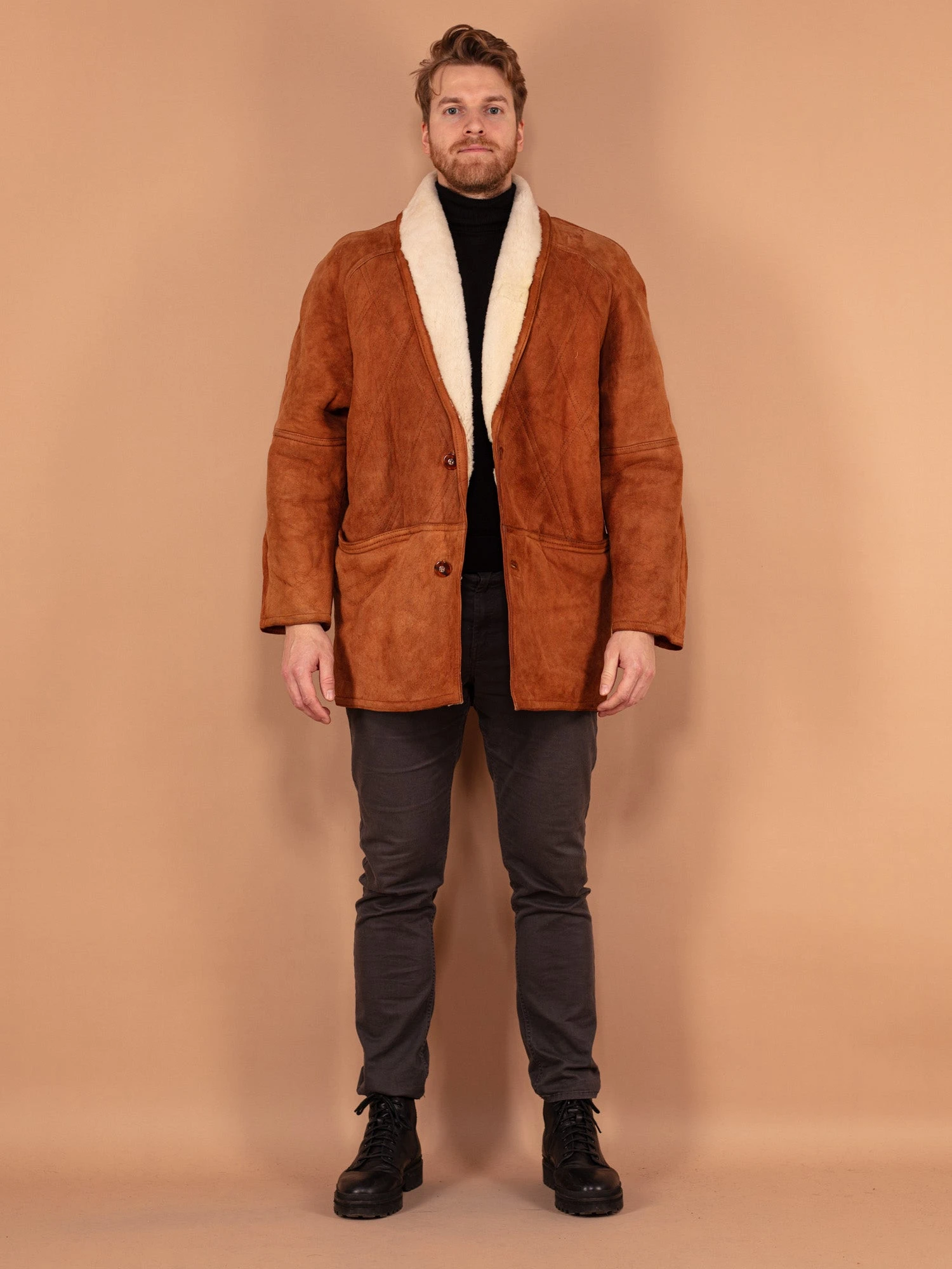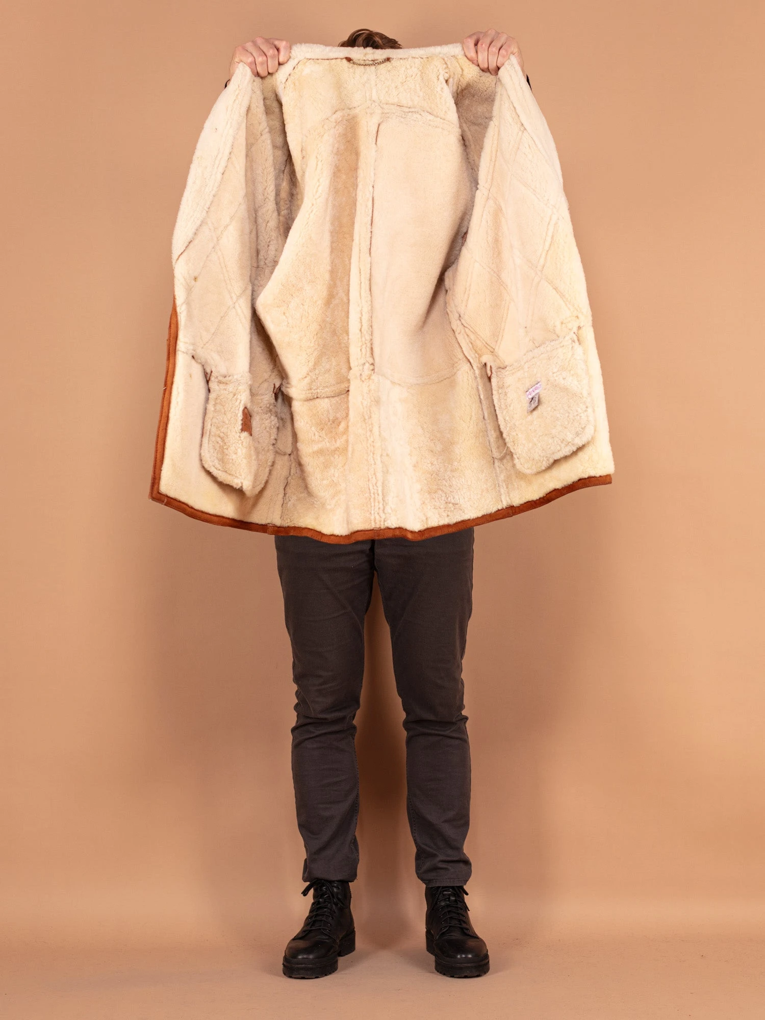 Vintage 80’s men’s thick and cozy shearling coat in caramel brown, made of genuine lambskin suede with really cozy and warm shearling wool on the inside. Designed with front summary closure, a shawl wool collar that can be closed in the colder days, raglan sleeves and two spacious outer pockets. Adorned with a delicate quilted design at front. You can be sure that this heavyweight boho coat will keep you warm and snug throughout the winters!
