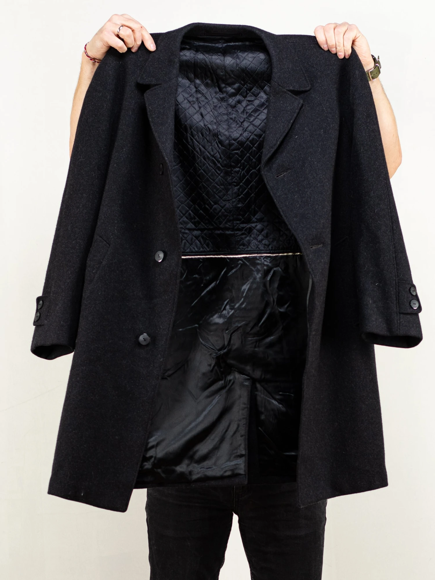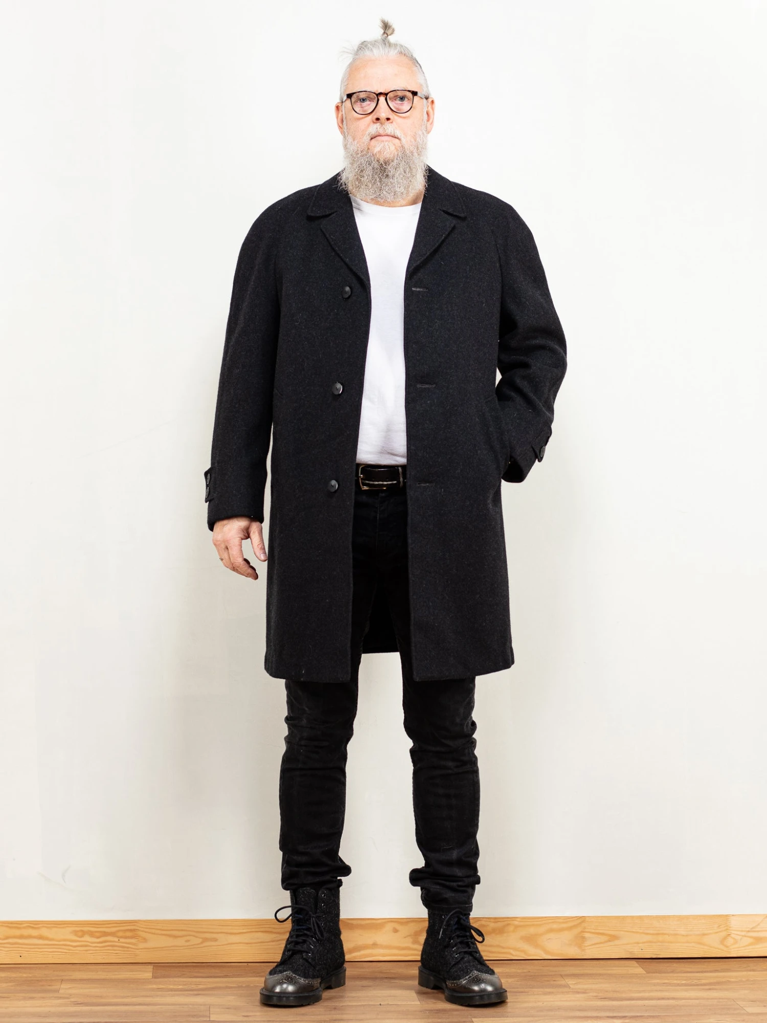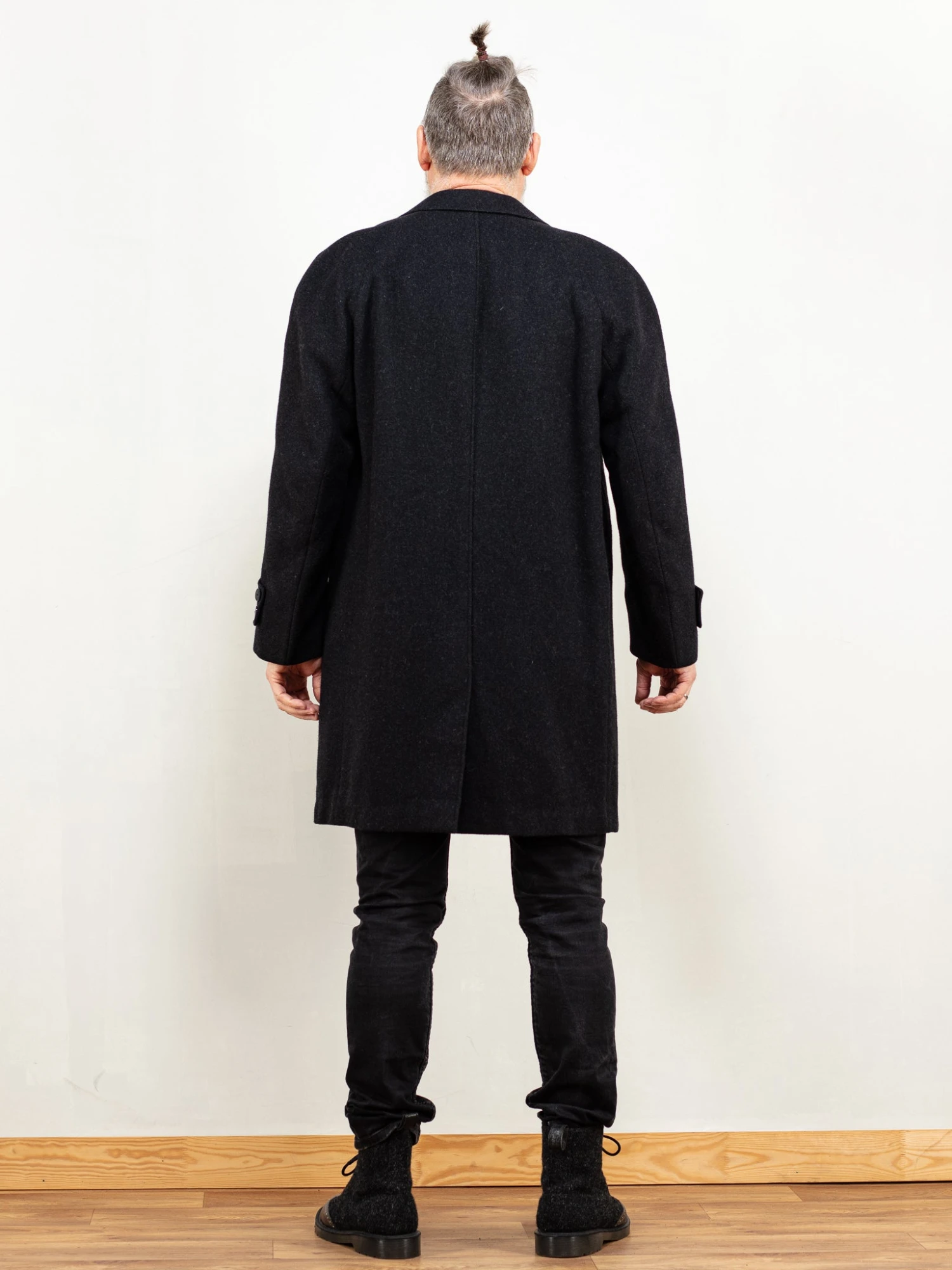Very classy vintage 80’s men’s wool coat in grey. Features a single-breasted summary closure with insulated lining on the bodice and sleeves. Two outer side pockets, and two inner breast pockets. Perfect for everyday wear.