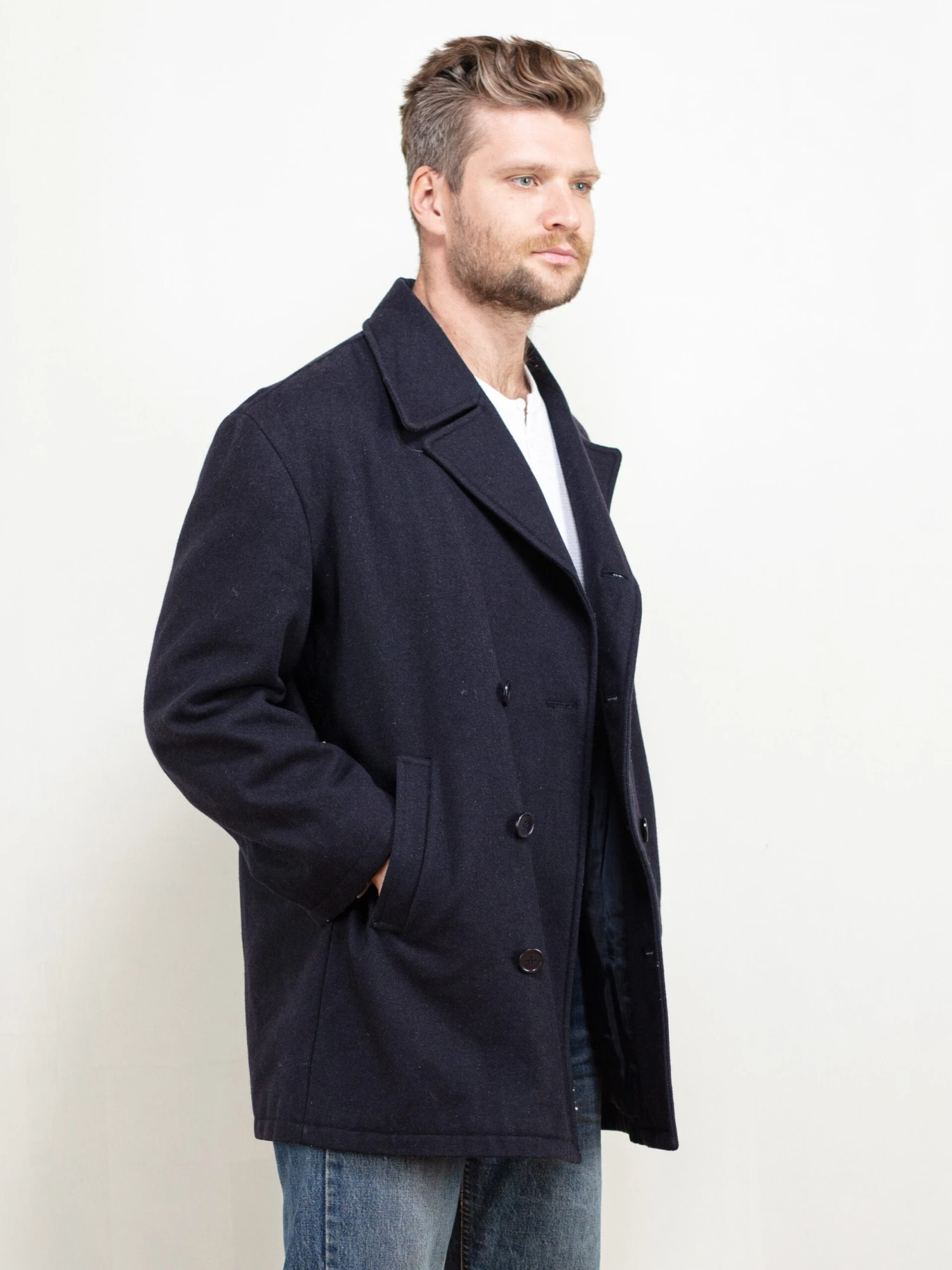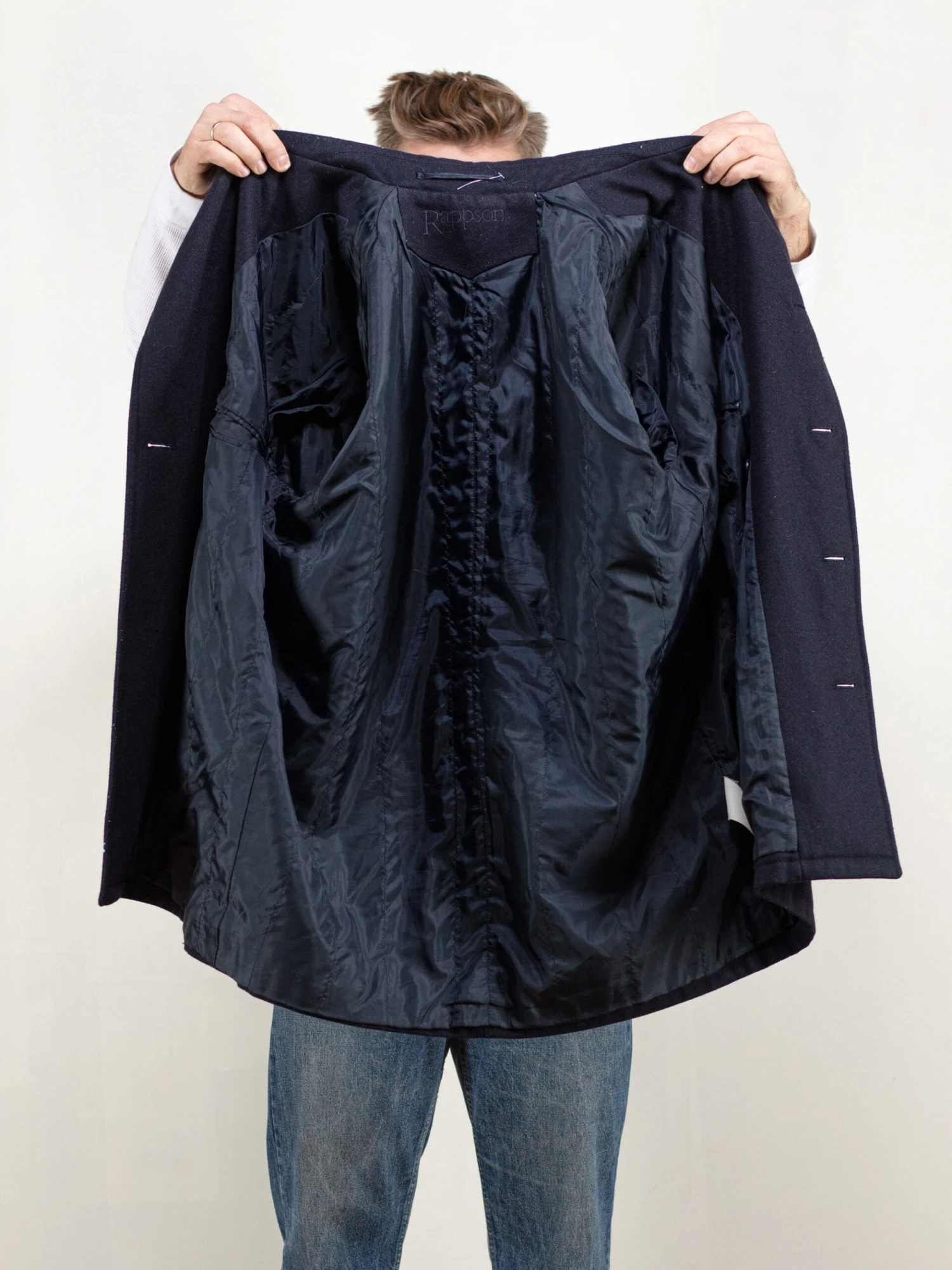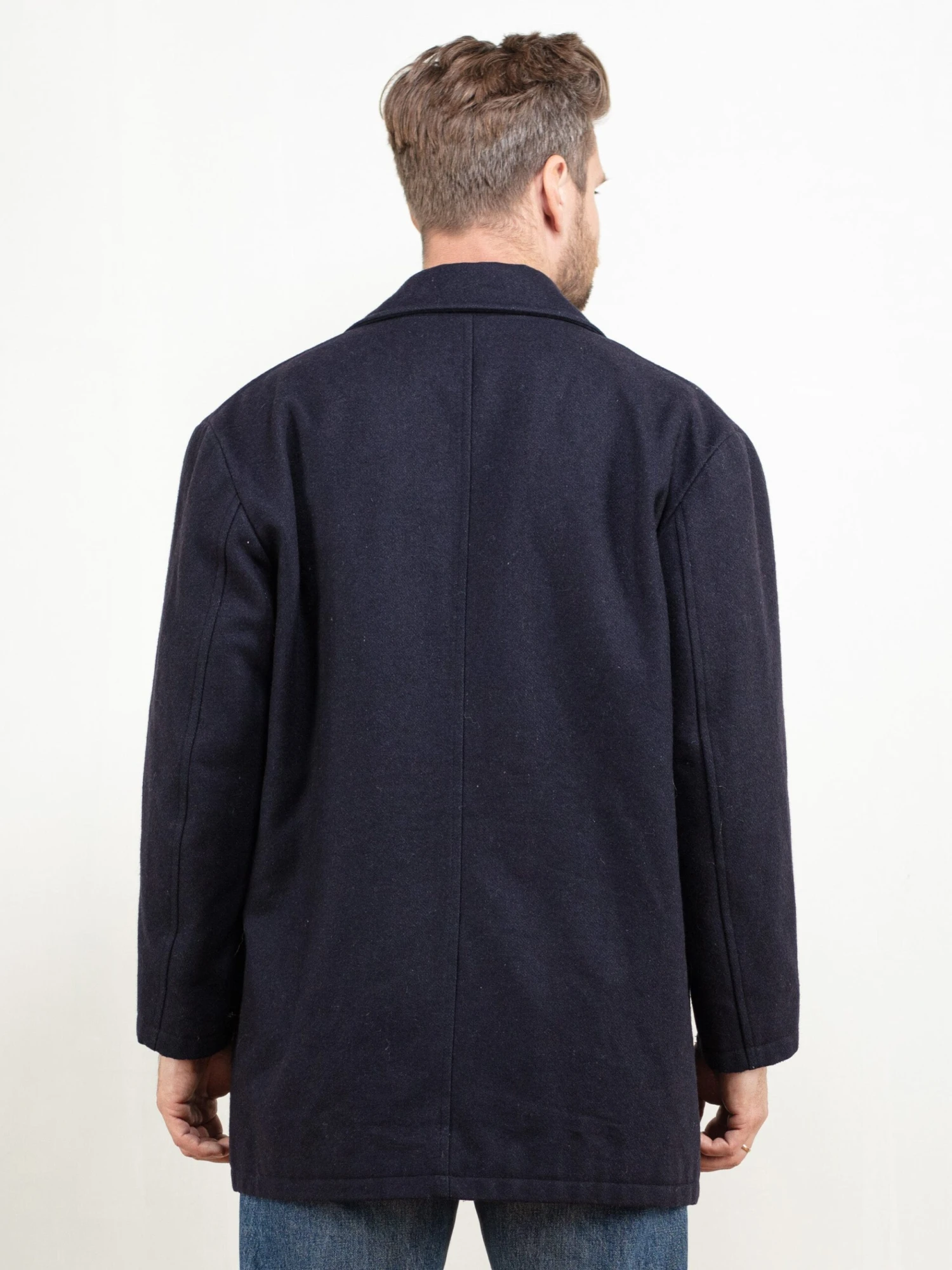 This is a vintage 80’s men’s wool coat in navy blue. Double-breasted fastening and two front pockets. One front summary is missing, priced accordingly.