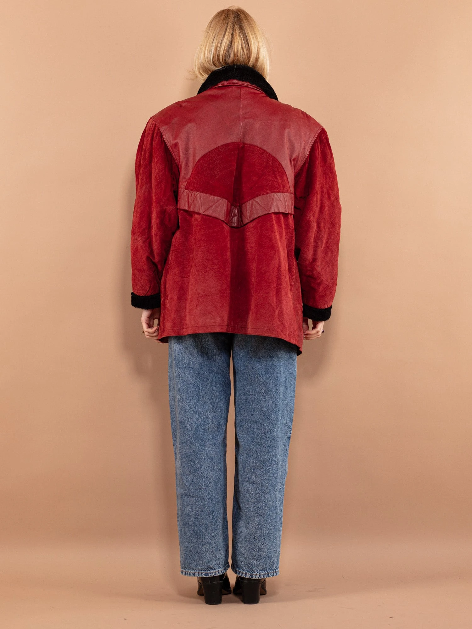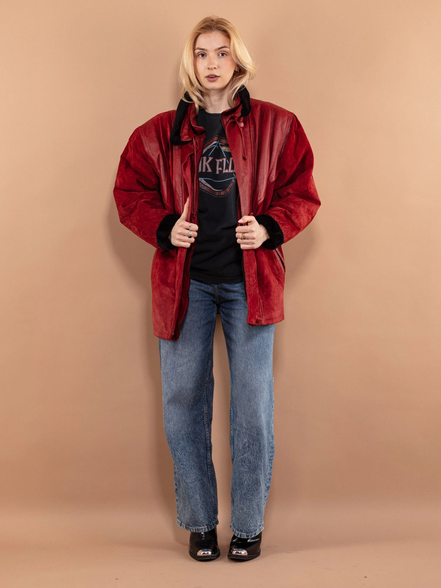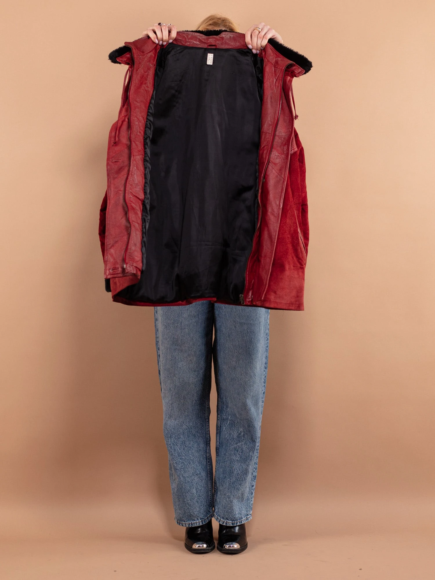 A red leather parka coat/jacket straight from the groovy 80s! The coat features a summary-concealed zipper closure and two outer pockets with sherpa-trimmed on the cuffs and collar. Made from a combination of genuine suede and leather and fully lined with slightly insulated polyester.