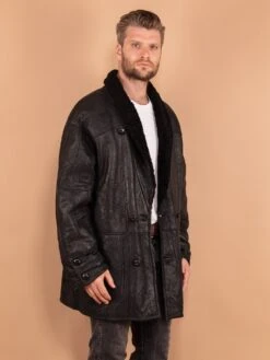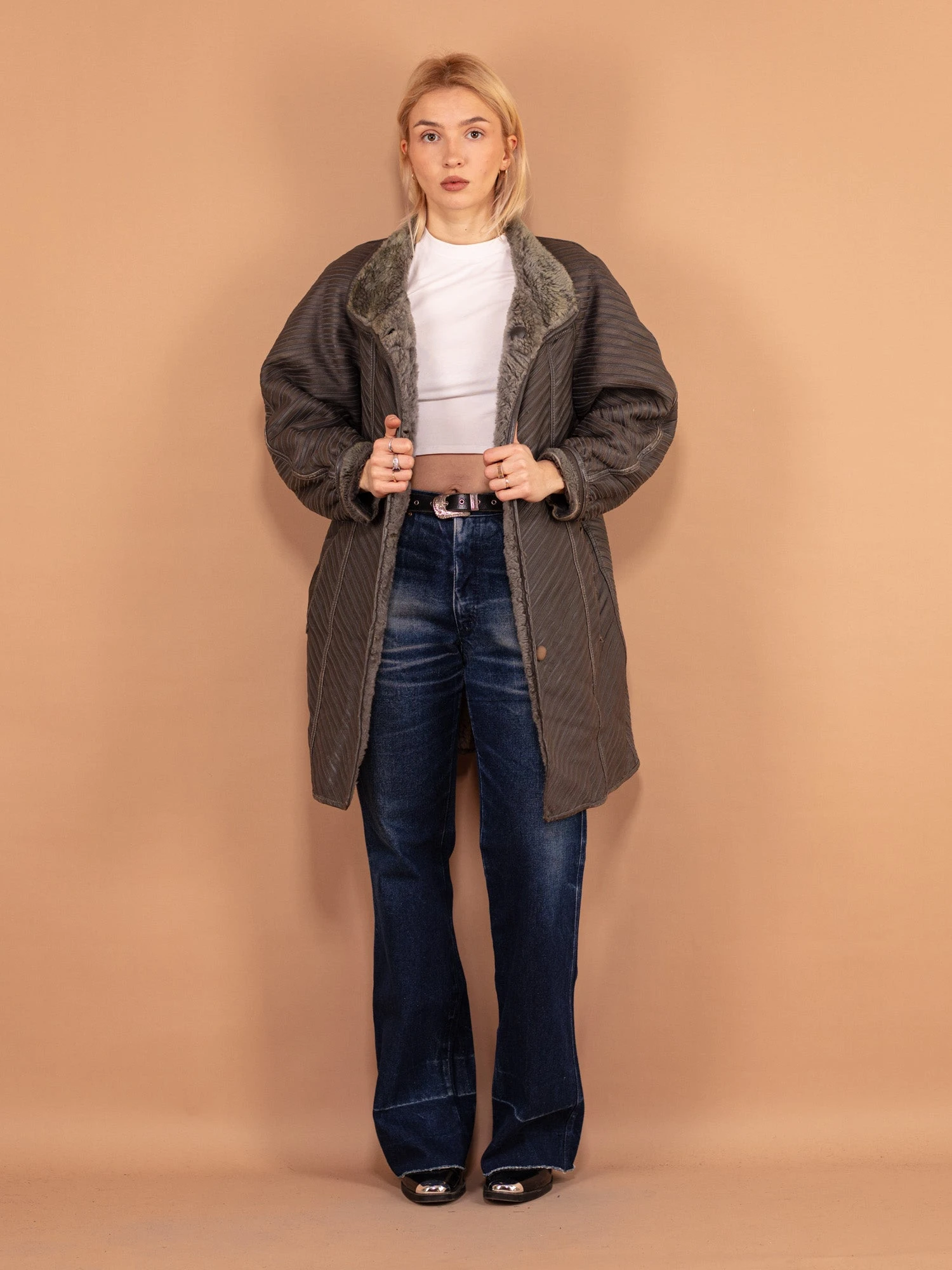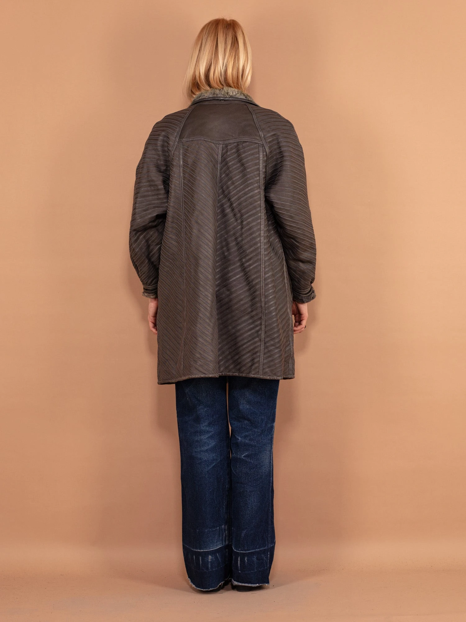 A sophisticated vintage 80’s women’s grey sheepskin coat in stripe pattern, made from patchwork leather with fuzzy sheep wool interior. The design features a front summary fastening, a band collar, raglan sleeves and two outer pockets. A great choice to stay warm, snug, and cozy throughout the cold days.