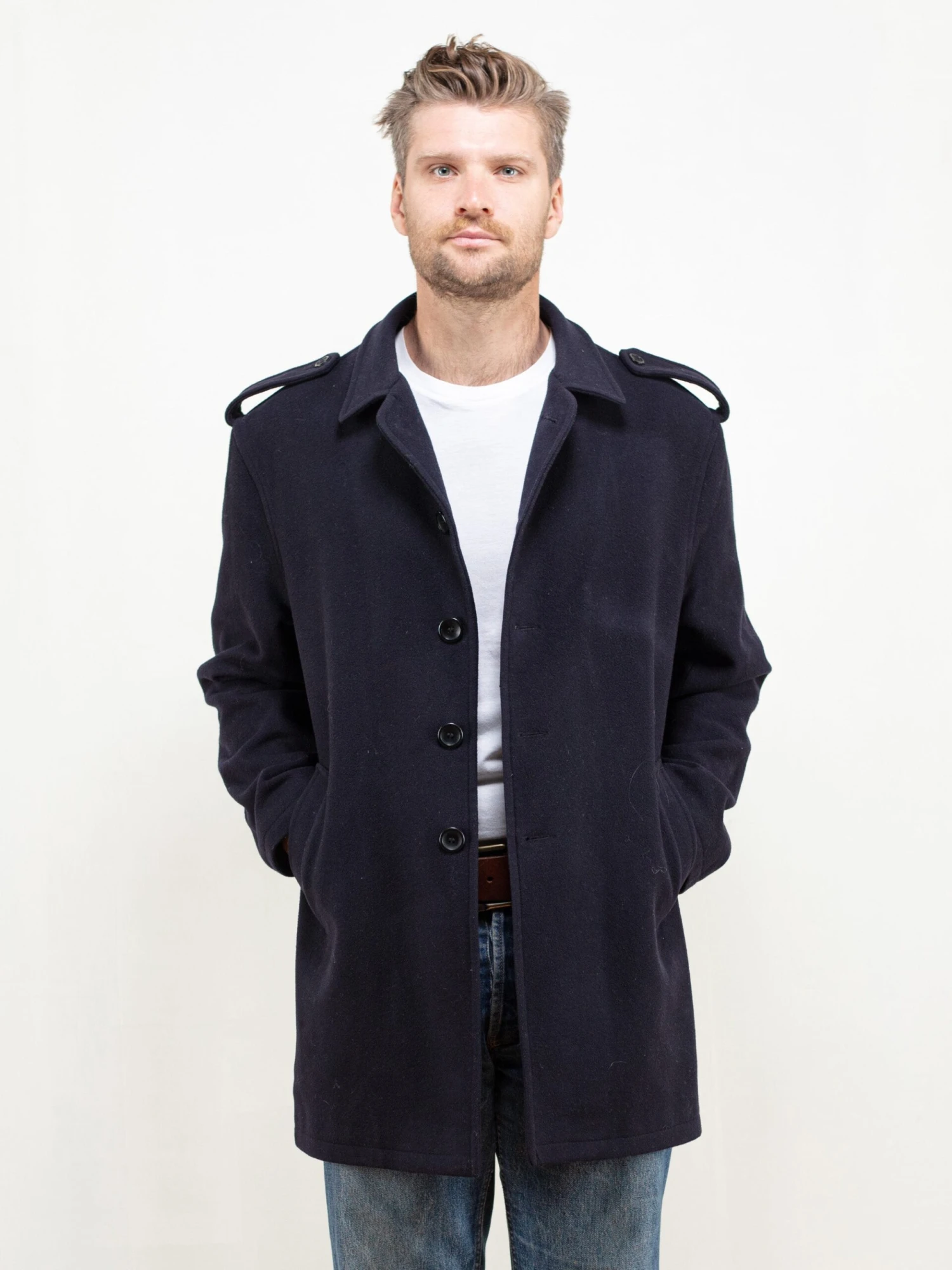 This is a classic vintage 90’s men’s wool peacoat in blue. Features two side pockets and one on the inside. 80% wool, 20% polyamide. Made in UK.