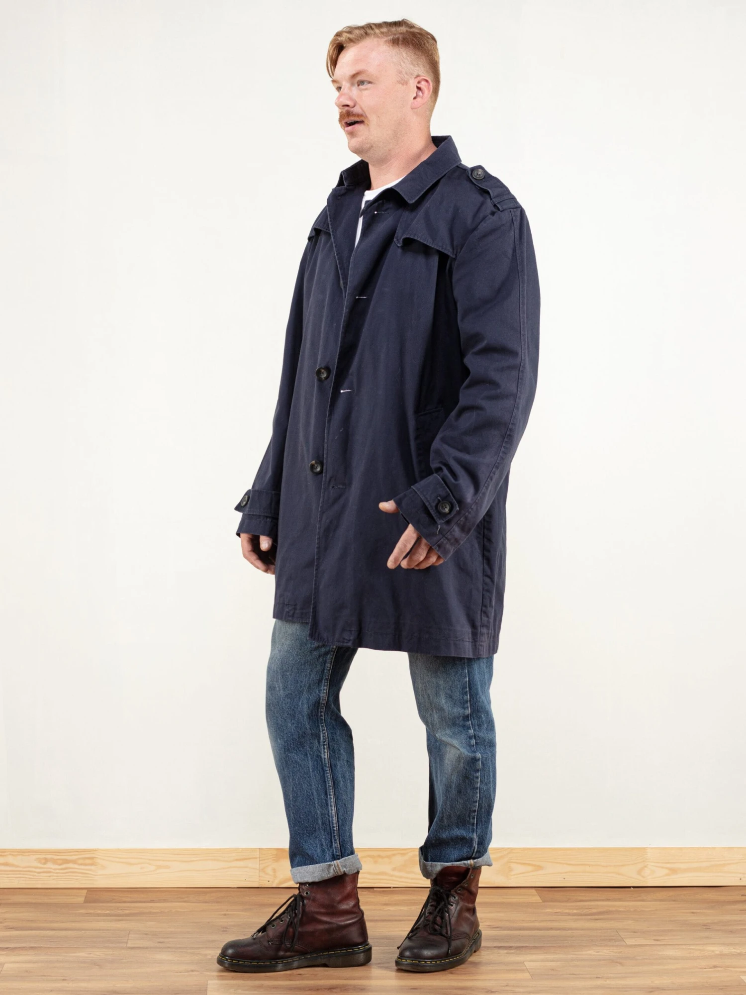 This is a vintage 90s men’s blue overcoat with a minimalistic look. Durable and beautiful garment. Made of cotton, two side pockets and one on inside. Has a belt.