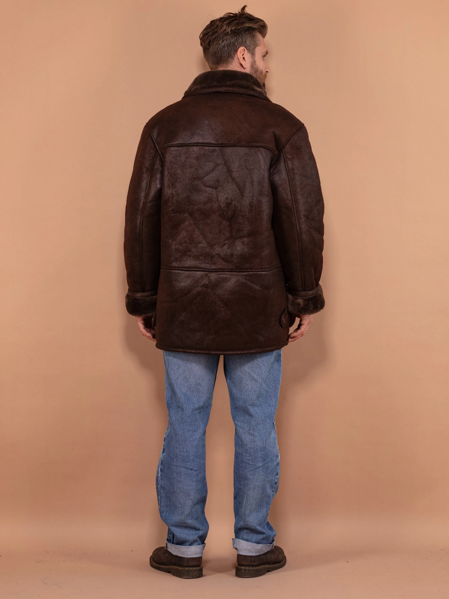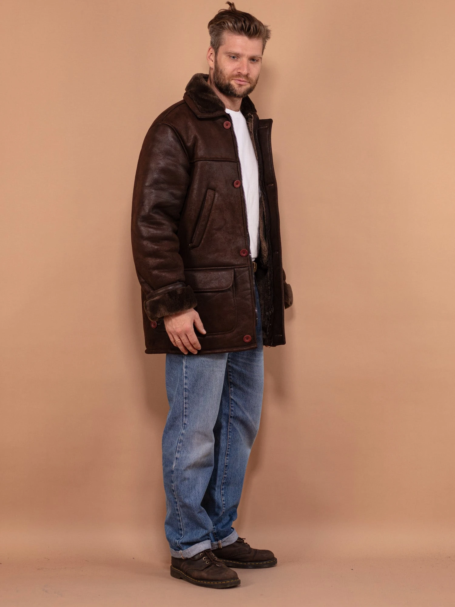 A vintage 90’s faux sheepskin coat in dark brown. Features a concealed plastic zipper + summary fastening, a flat collar, four outer pockets and cozy sherpa lining. This coat captures the look of a real sheepskin but is thoughtfully designed without harming animals as it’s made of 100% synthetic materials.