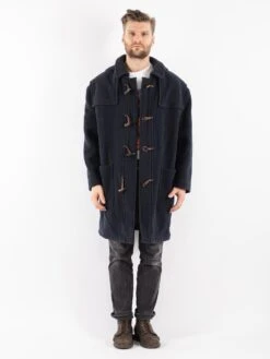 Blue Vintage 90’s Men Hooded Wool Duffle Coat in Blue Wool With Free Delivery