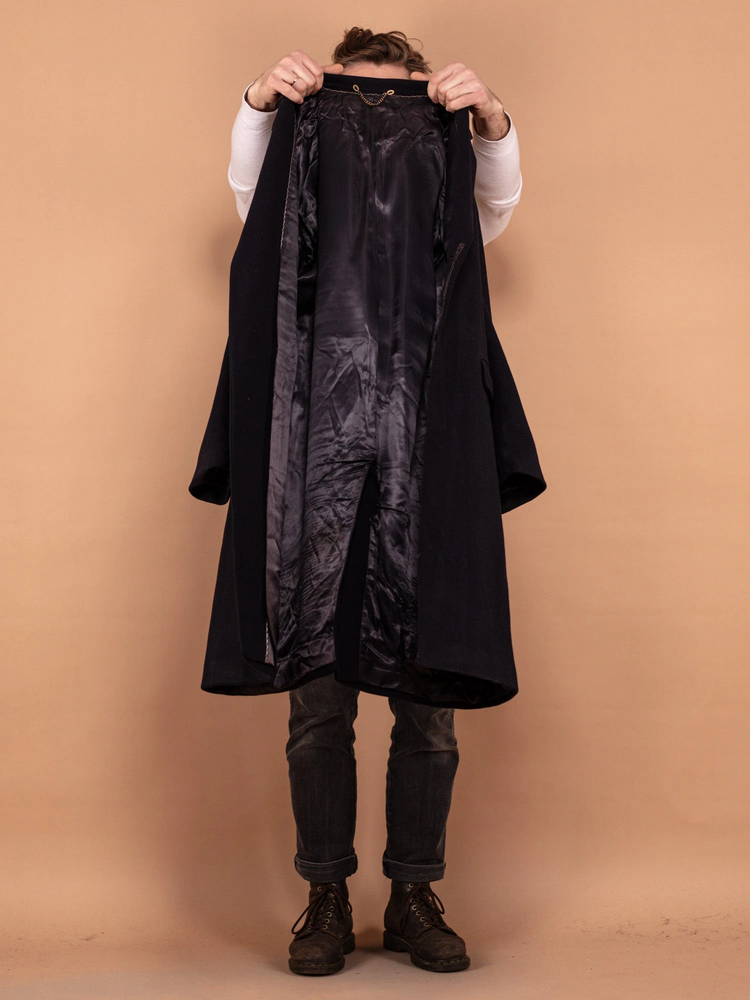 A vintage navy blue wool coat from the 90s. The classic design features a notched collar and single-breasted summary closure with two front-entry flap pockets, and one breast pocket inside. It is made from pure new wool and fully lined with deep blue viscose fabric.