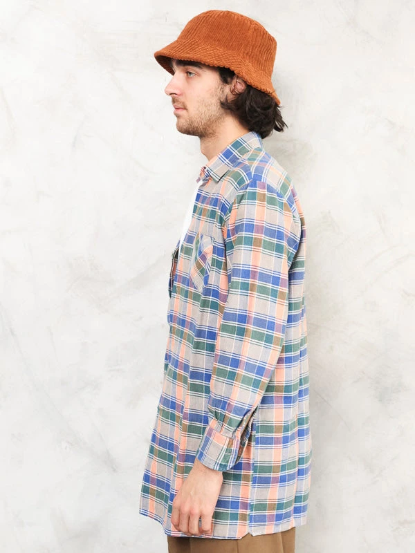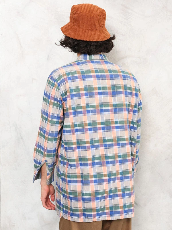 This is a marvelous vintage 90’s plaid smock shirt in multi-color check print. Made of soft cotton fabric.