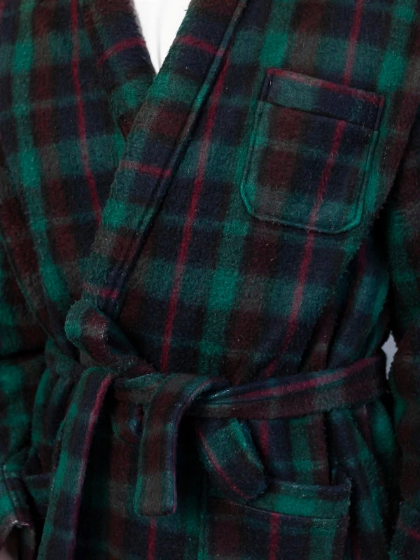 This is a vintage 90s green plaid cigar jacket / morning robe made of polyester and acrylic fabric. Two side pockets.